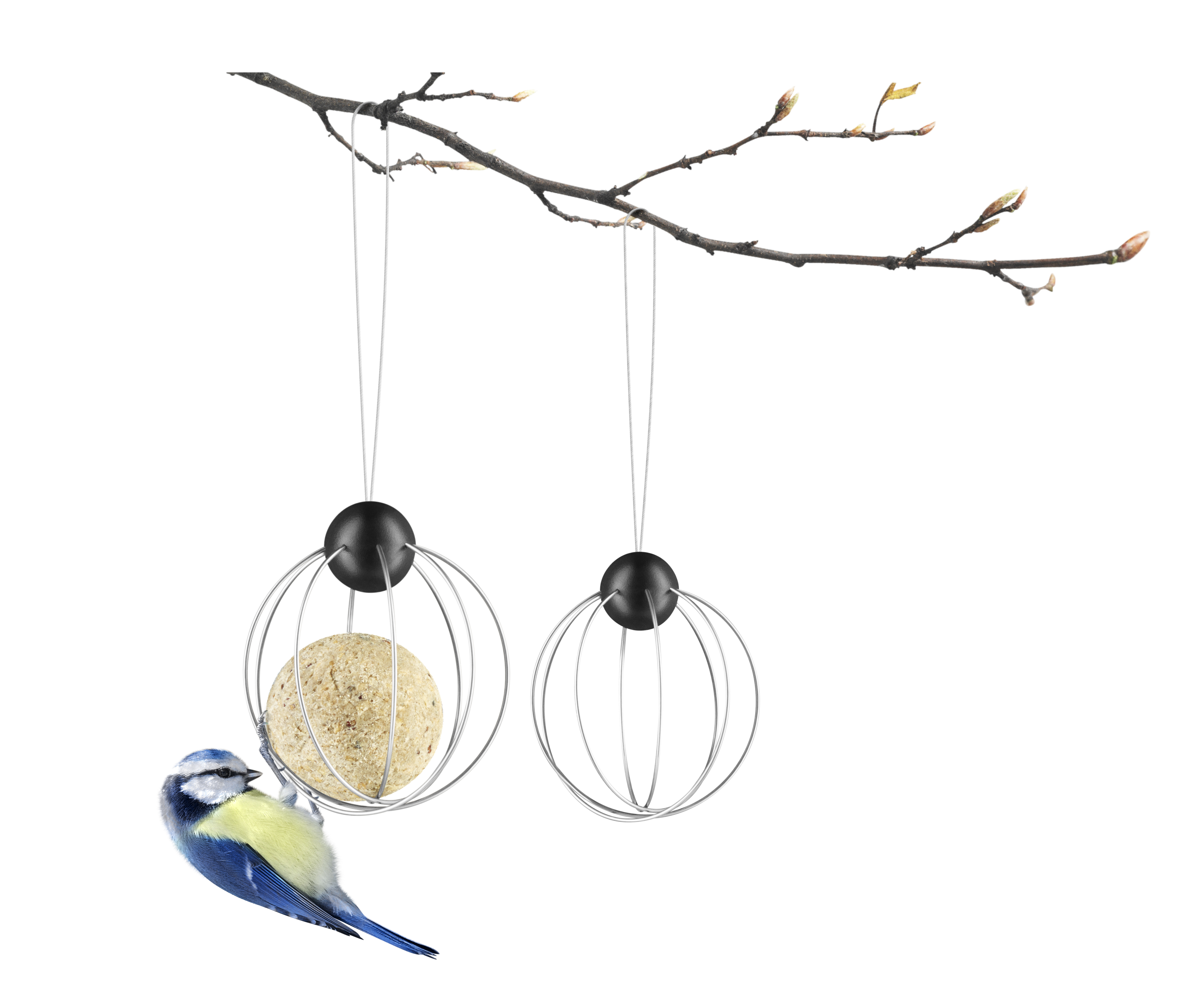 Mejsekugleholderne fra Eva Solo. Holderen er designet så mejsekuglen ikke falder ud, og samtidig er den nem at hænge op i haven eller på altanen. Holderen sikrer også at større fugle ikke flyver væk med mejsekuglen.