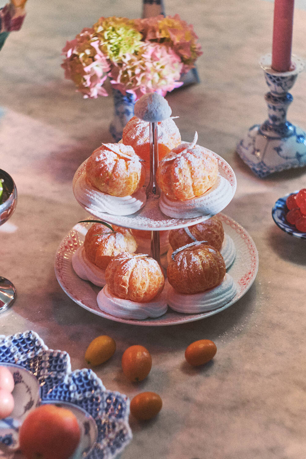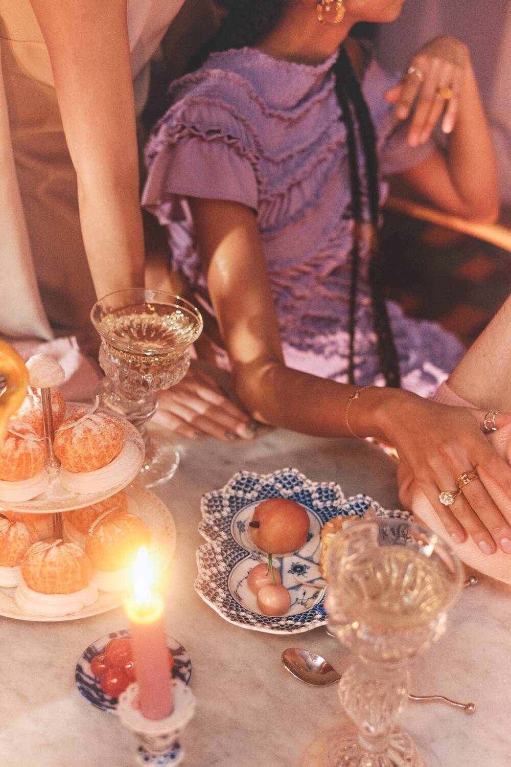 - Koralfarvede blonder langs kanten