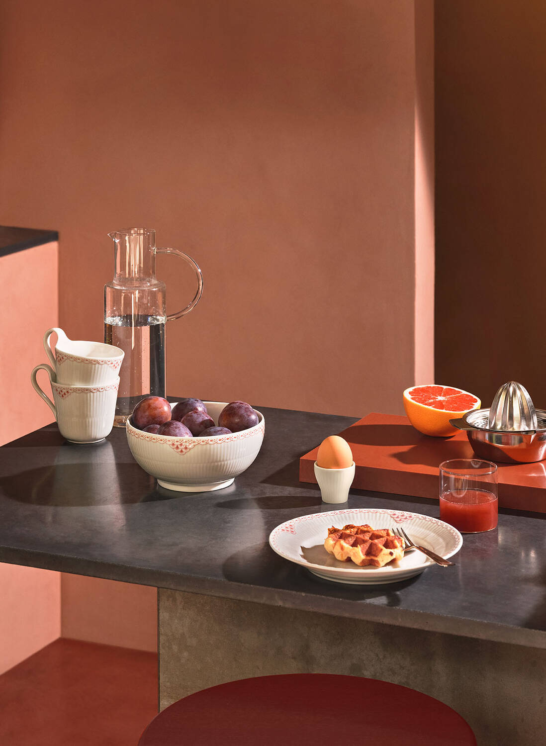 Udtrykket er enkelt, linjerne elegante og formen klassisk. Hvid Riflet udstråler en speciel moderne renhed, som skandinavisk design er berømt for i hele verden. Hvid Riflet giver borddækningen et rent og stilfuldt udtryk, og stellet kan bruges både til hverdag og fest. I 2004 blev Hvid Riflet introduceret, men selve stellets grundform er flere generationer gammelt. Hvid Riflet er egentlig grundformen bag flere af de andre stel - bl.a. Musselmalet Riflet og Musselmalet Mega, som stammer helt tilbage fra det 19. århundrede. Den riflede form stammer oprindeligt fra det klassiske Musselmalet Riflet, som fik sit navn efter muslingens riflede skal. Den dag i dag bliver en del af stellet stadig fremstillet ved håndkraft blandt andet støbningen, påsætning af hanke og glasering. Hvid Riflet er i øvrigt skabt efter de samme gamle forfinede håndværkstraditioner, som startede for mere end 200 år siden, da Royal Copenhagen blev grundlagt. Designeren er Arnold Krog.