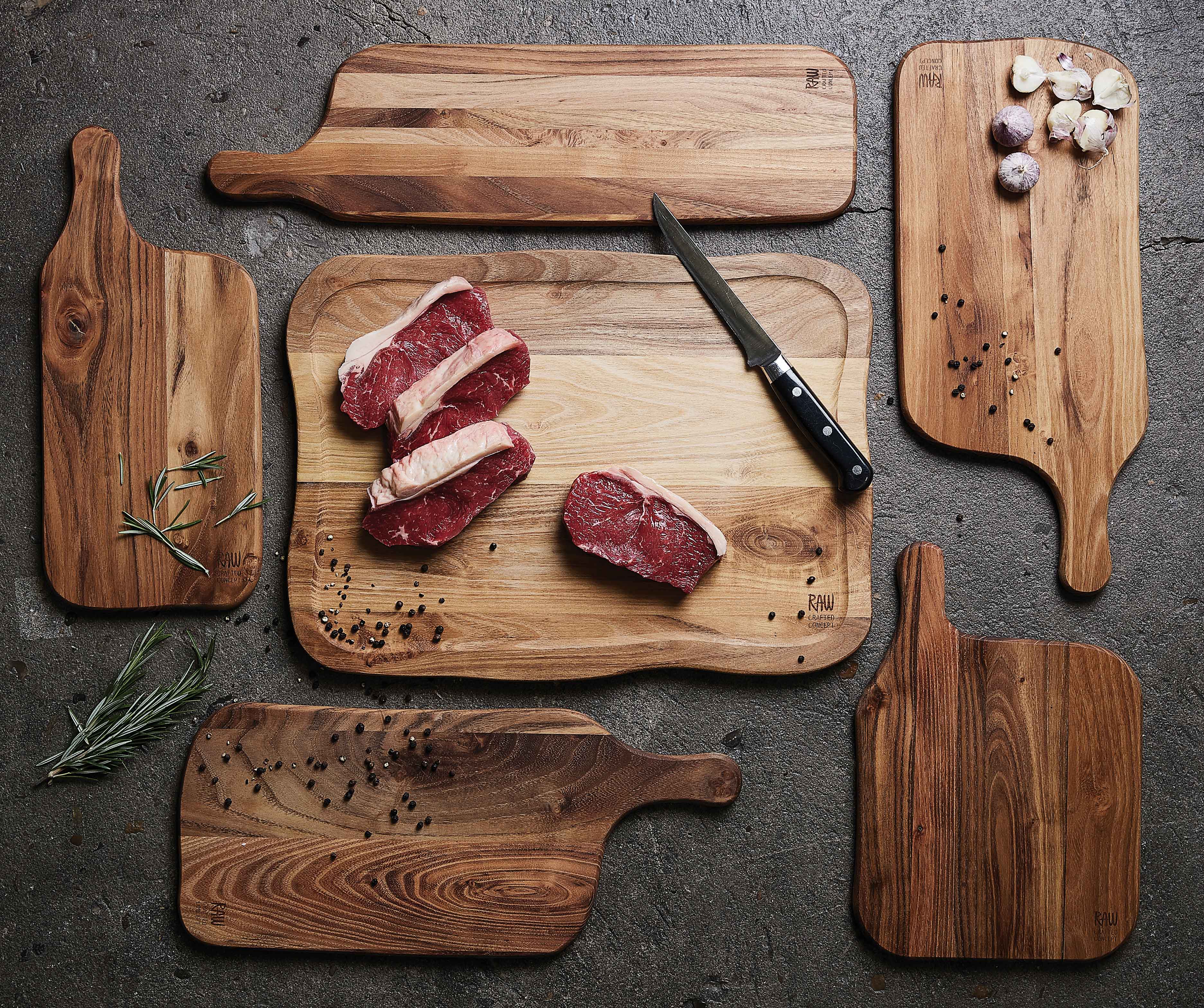 Oplev skærebrættet fra RAW, der er lavet i det smukke og holdbare teaktræ. Dette elegante skærebræt er designet med en praktisk saftrille, der hjælper med at holde din bordplade ren ved at opsamle saft fra kød og frugt. Den organiske, buede form giver ikke kun et æstetisk tiltalende udseende, men gør det også nemt at håndtere.