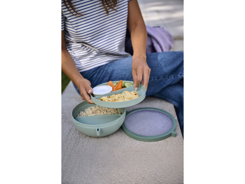 - Indeholder et minibæger til f.eks. dressing eller nødder