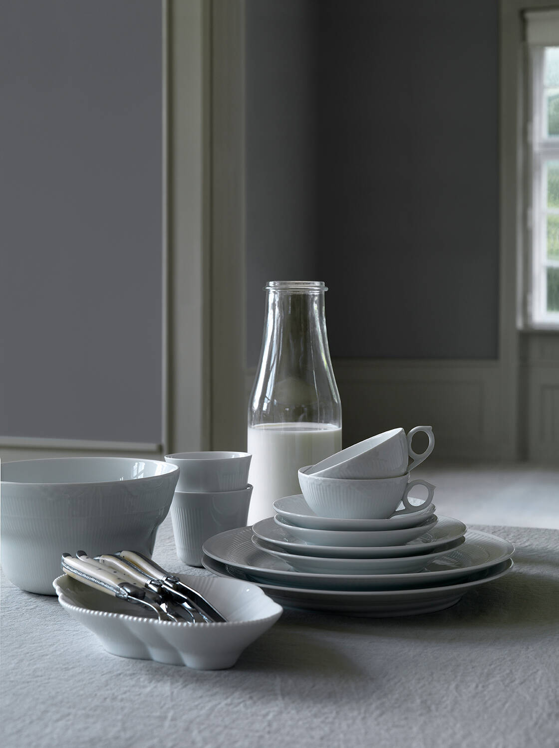 Udtrykket er enkelt, linjerne elegante og formen klassisk. Hvid Riflet udstråler en speciel moderne renhed, som skandinavisk design er berømt for i hele verden. Hvid Riflet giver borddækningen et rent og stilfuldt udtryk, og stellet kan bruges både til hverdag og fest. I 2004 blev Hvid Riflet introduceret, men selve stellets grundform er flere generationer gammelt. Hvid Riflet er egentlig grundformen bag flere af de andre stel - bl.a. Musselmalet Riflet og Musselmalet Mega, som stammer helt tilbage fra det 19. århundrede. Den riflede form stammer oprindeligt fra det klassiske Musselmalet Riflet, som fik sit navn efter muslingens riflede skal. Den dag i dag bliver en del af stellet stadig fremstillet ved håndkraft blandt andet støbningen, påsætning af hanke og glasering. Hvid Riflet er i øvrigt skabt efter de samme gamle forfinede håndværkstraditioner, som startede for mere end 200 år siden, da Royal Copenhagen blev grundlagt. Designeren er Arnold Krog.
