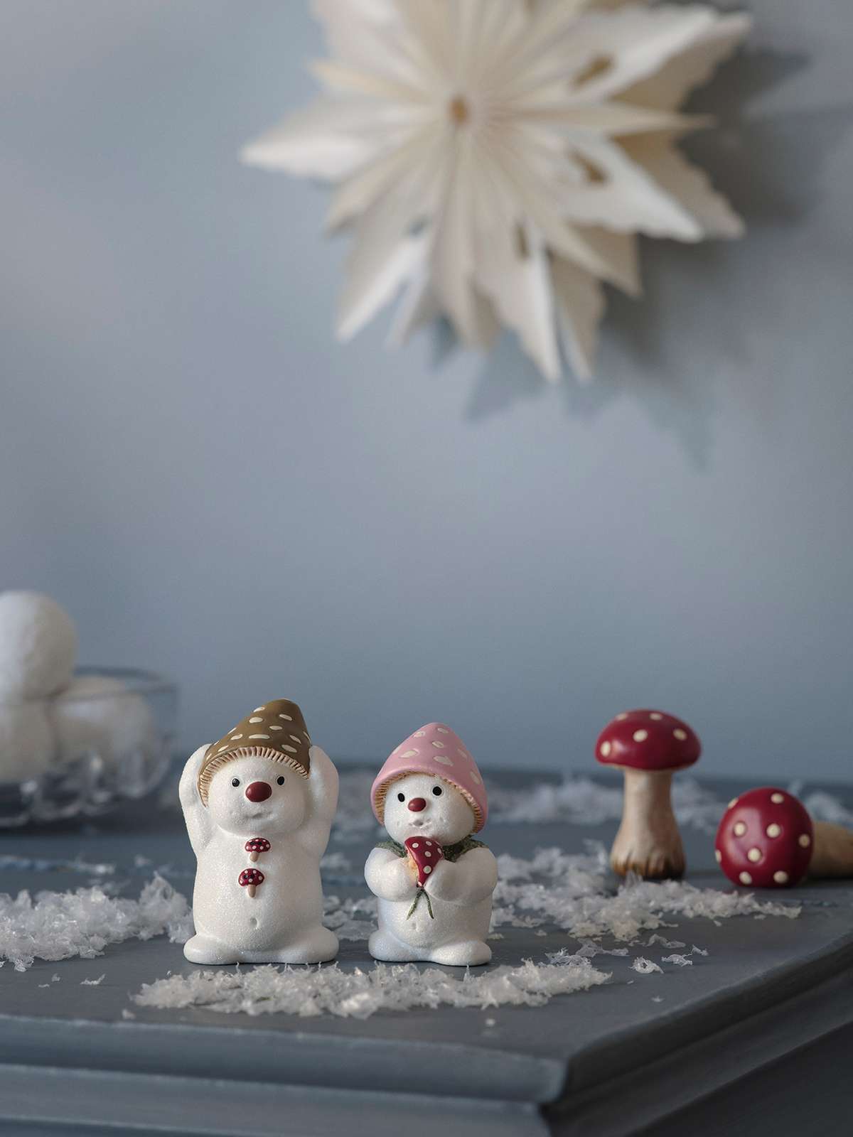 De to små snemænd er formet med et væld af detaljer, herunder dekorative svampe, som giver dem et ekstra skud personlighed. Med en højde på blot 5 cm passer de perfekt ind i enhver juledekoration, hvor de kan bringe glæde og smil til både børn og voksne. Det er værd at bemærke, at små variationer kan forekomme fra figur til figur, hvilket understreger deres håndlavede karakter og autenticitet. Gør Disa & Obert til en fast tradition i din juleudsmykning og lad dem blive en favorit blandt dine julefigurer år efter år.
