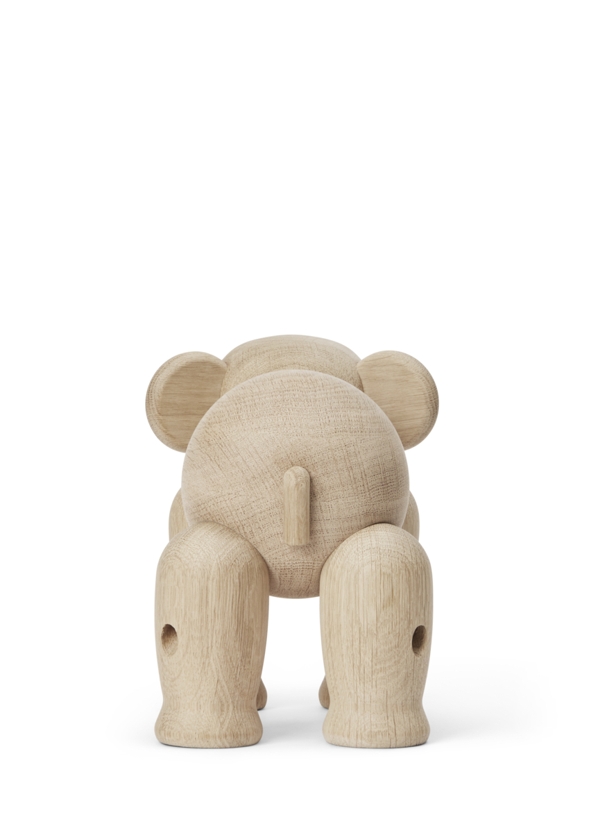Den imponerende Store Elefant fra Kay Bojesen er mere end blot en træfigur; den er et tidløst designikon og et eftertragtet samlerobjekt. Denne elefant, der er lavet i FSC®-certificeret ubehandlet egetræ, fremstår i sin naturlige skønhed og hylder den organiske æstetik. Med sine bevægelige dele - hoved, snabel og ben - kan elefanten justeres og tilpasses, hvilket tilføjer en dynamisk dimension til ethvert rum.