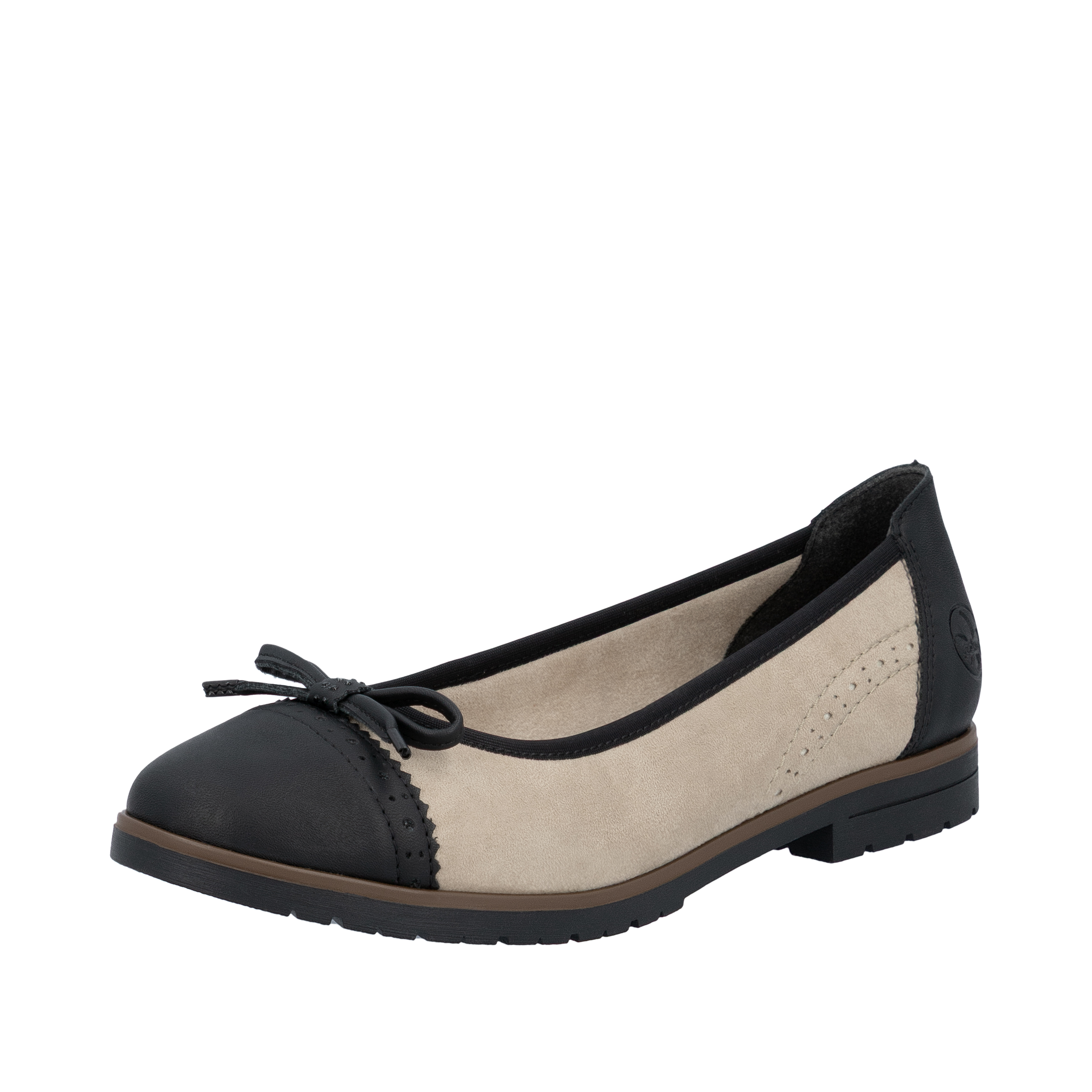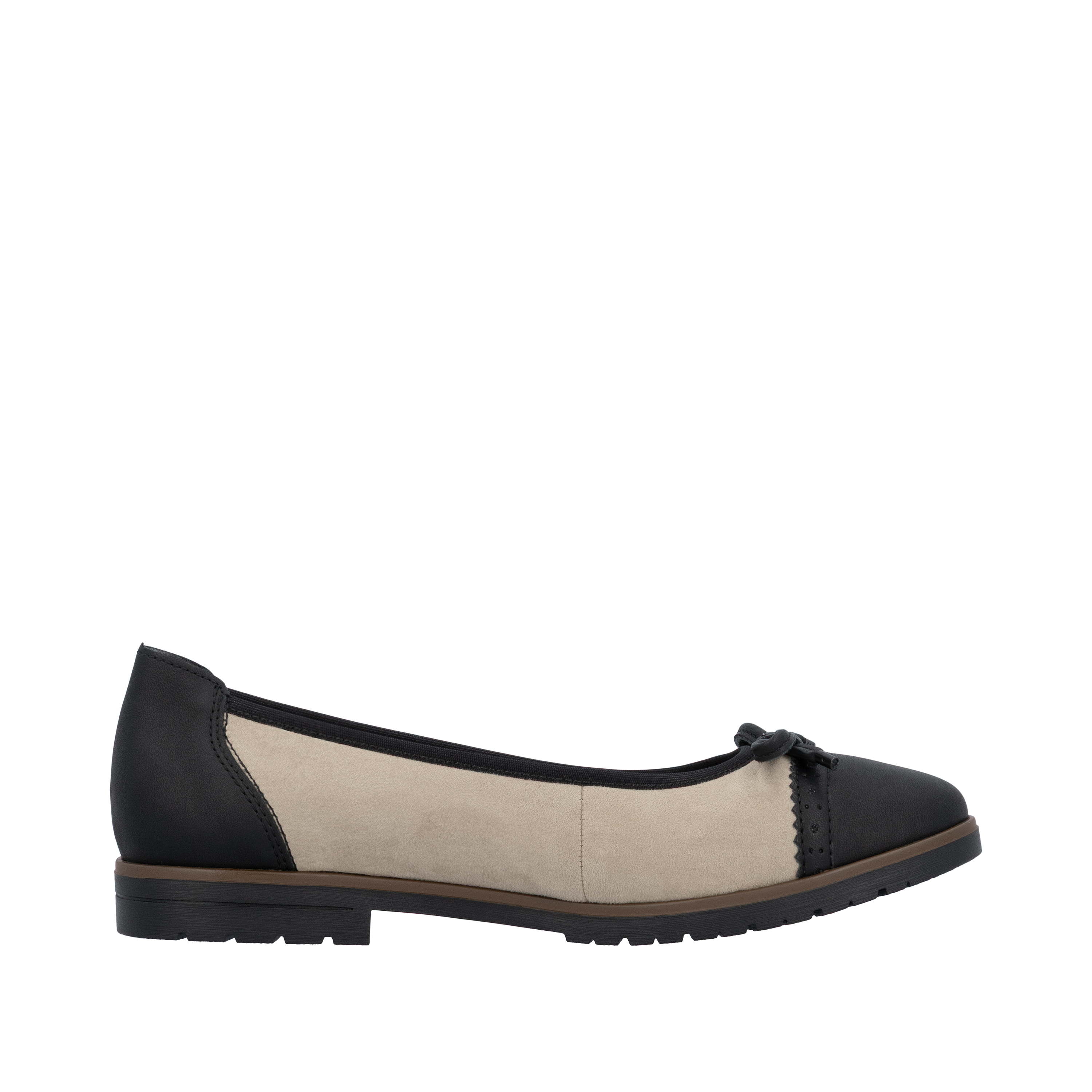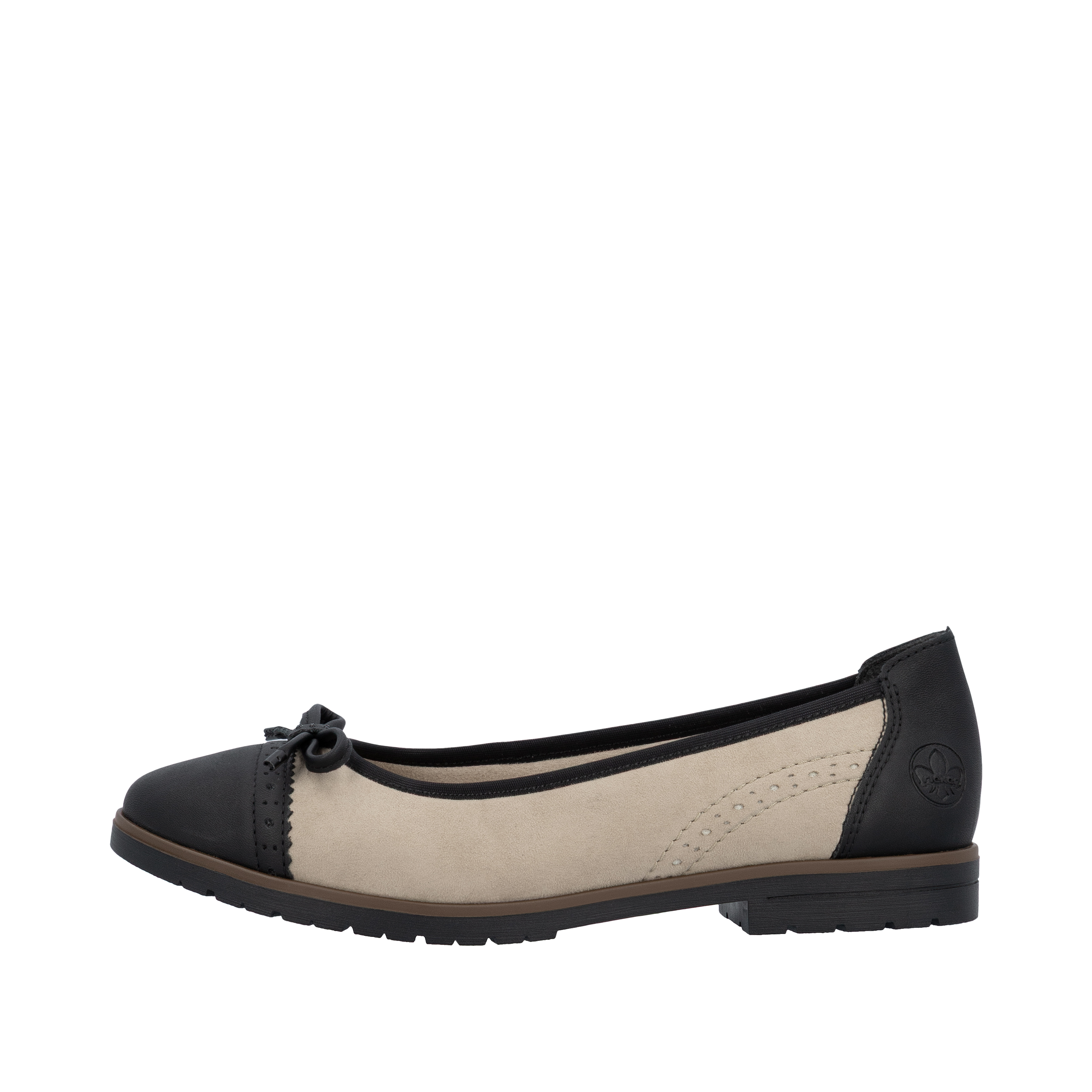 Den lave blokhæl giver en behagelig højde og stabilitet, så dine fødder forbliver komfortable dagen lang. Foran på skoene finder du en charmerende sløjfe, der tilføjer en feminin detalje, mens kontrast snude og hæl giver skoene et moderne twist. Disse stilfulde ballerinasko fra Rieker er ikke kun alsidige, men også en stilfuld tilføjelse til ethvert look, uanset om det er til arbejde, hverdagens ærinder eller en aften ude.