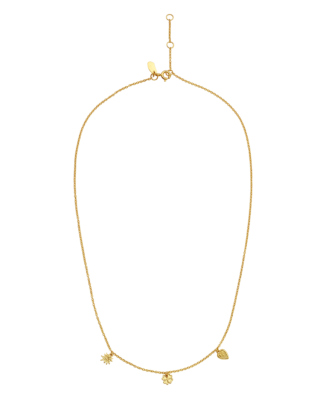 Nanna Halskæde fra Maanesten er en udsøgt tilføjelse til enhver smykkesamling. Denne elegante halskæde er fremstillet i forgyldt sterlingsølv, hvilket sikrer et smukt og holdbart design, der vil tiltrække opmærksomhed ved enhver lejlighed. Den unikke kombination af charmerende motiver, herunder sol, firkløver og hjerte, tilføjer en personlig og symbolsk dimension, hvilket gør den til en fremragende gaveidé eller en betydningsfuld personlig accessoire.