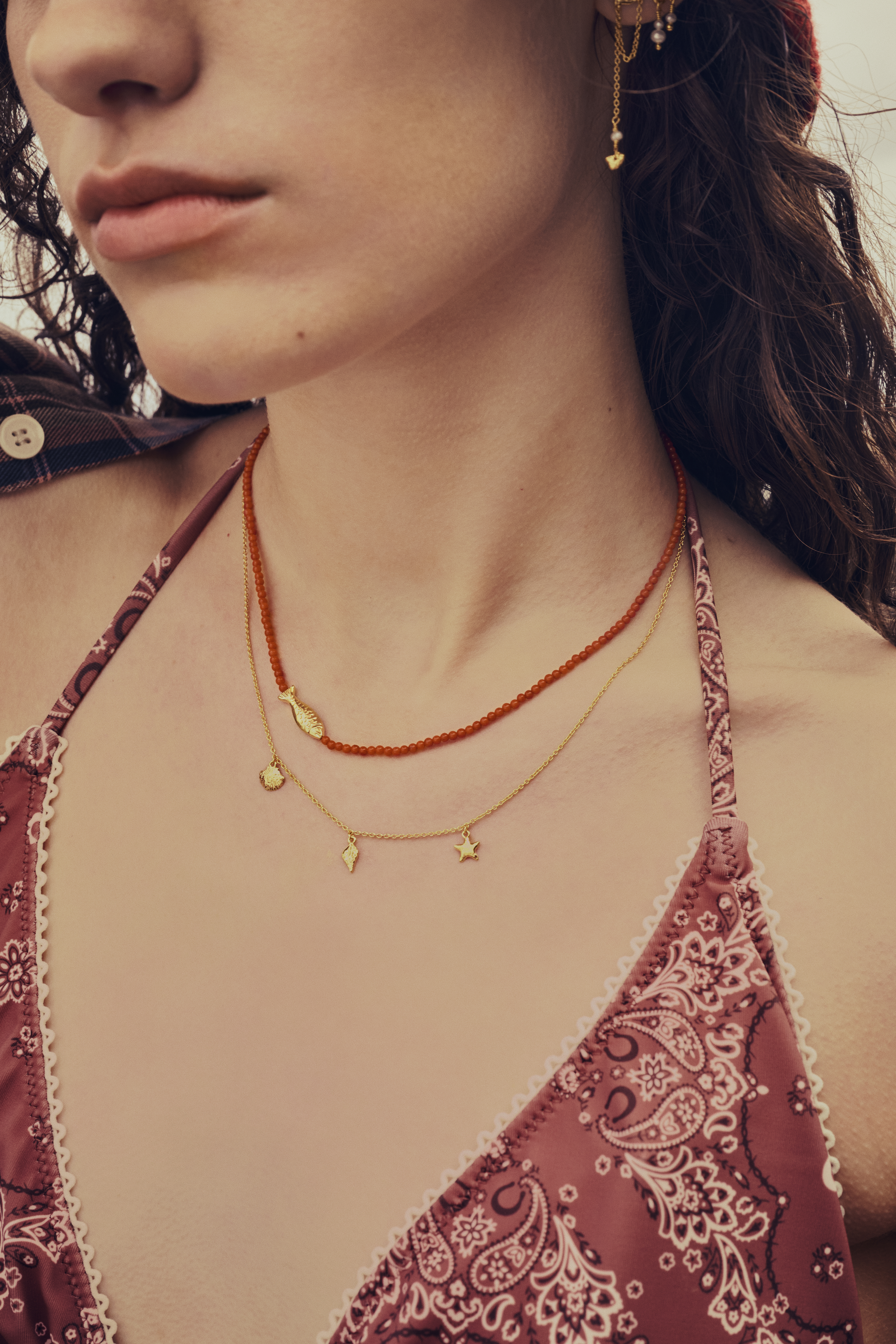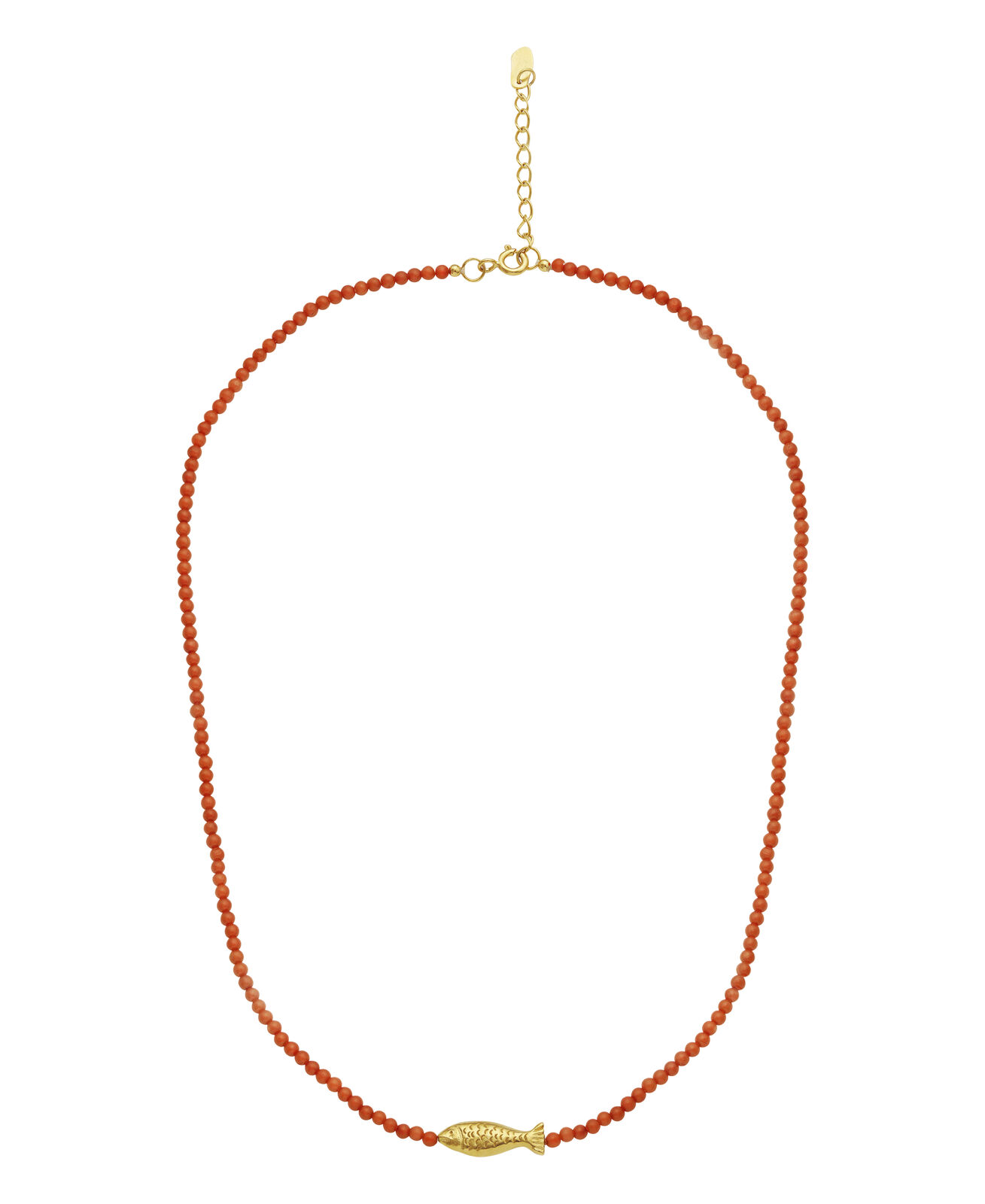 Reef Halskæde fra Maanesten er en smuk tilføjelse til enhver smykkesamling. Denne halskæde er fremstillet af forgyldt sterlingsølv, hvilket giver den et elegant og sofistikeret udtryk, der passer perfekt til både hverdag og festlige lejligheder. Halskæden er en rød koral stenkæde, der tilføjer en unik farvekontrast og et strejf af natur til designet. Et af de mest iøjnefaldende elementer ved denne halskæde er vedhænget, der er formet som en fisk. Dette vedhæng tilføjer en kreativ og legende dimension til smykket, hvilket gør det til et perfekt valg for dem, der ønsker at udtrykke deres personlighed gennem deres accessories. Halskæden har en længde på 40 cm, men kan forlænges med yderligere 3 cm for at sikre den perfekte pasform. Med sine gulddetaljer og den smukke kombination af materialer tilbyder Reef Halskæde fra Maanesten et stilfuldt og moderne look.