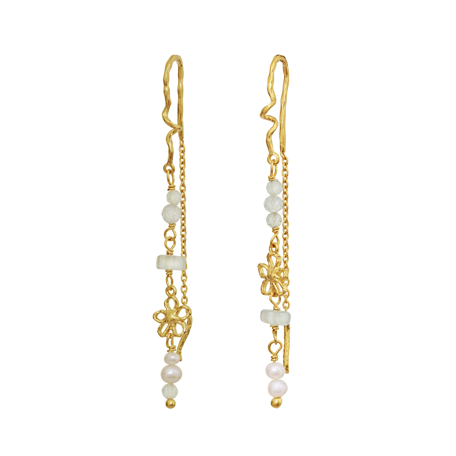 Hver ørering er udsmykket med smukke ferskvandsperler og den delikate grønne sten, prehnit, som skaber en harmonisk farvekombination. Øreringene prydes desuden af et charmerende blomstermotiv, der giver et feminint og naturligt touch. Med en længde på 57 mm er disse øreringe perfekte til at gøre et subtilt, men bemærkelsesværdigt indtryk. Uanset om du bærer dem til hverdag eller en særlig lejlighed, vil Alfrida Øreringe fra Maanesten tilføje et stilfuldt præg til din smykkesamling.