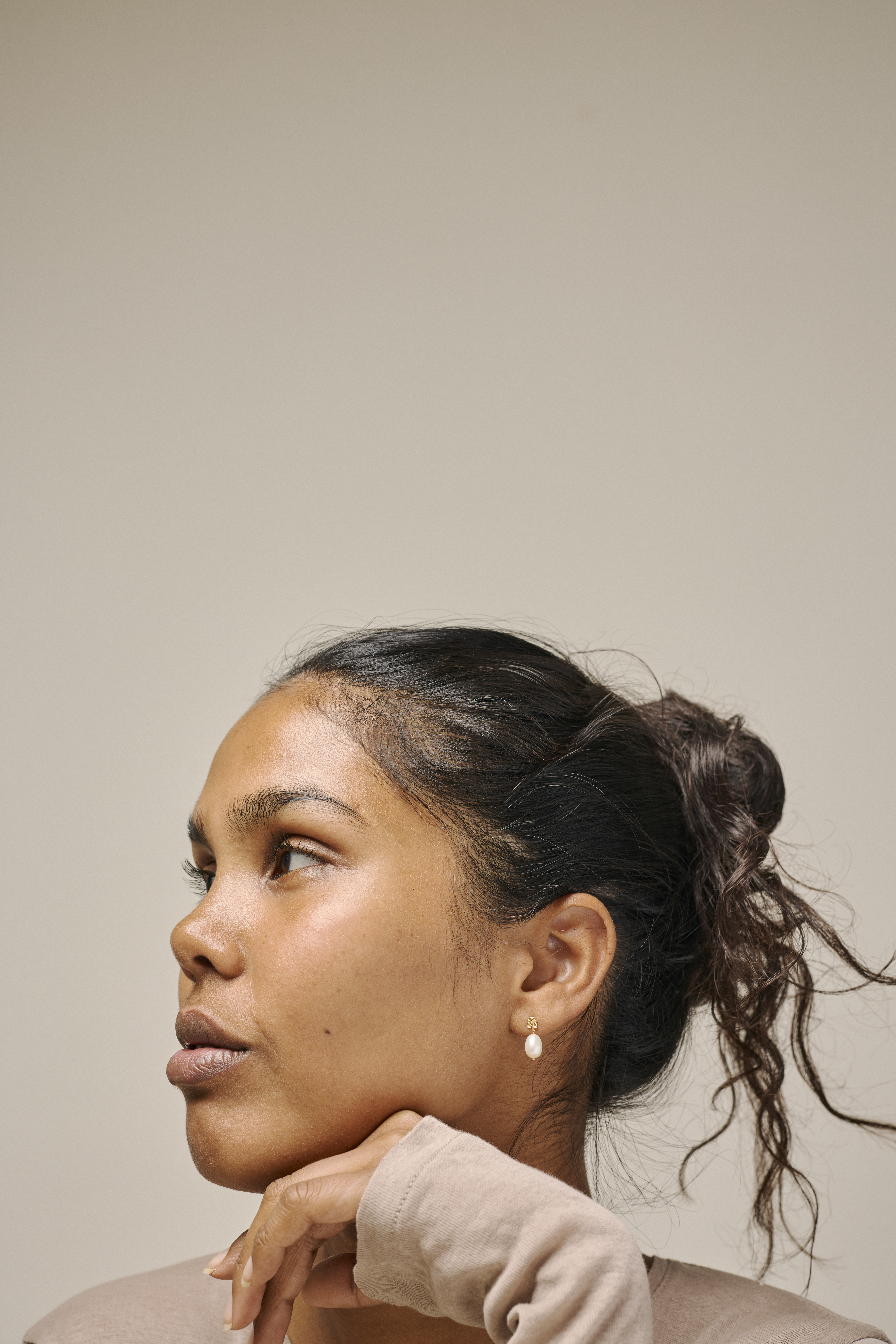 - Hænger ned fra øret