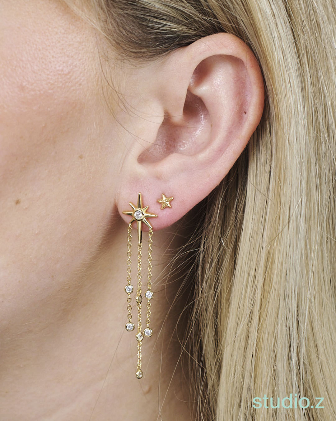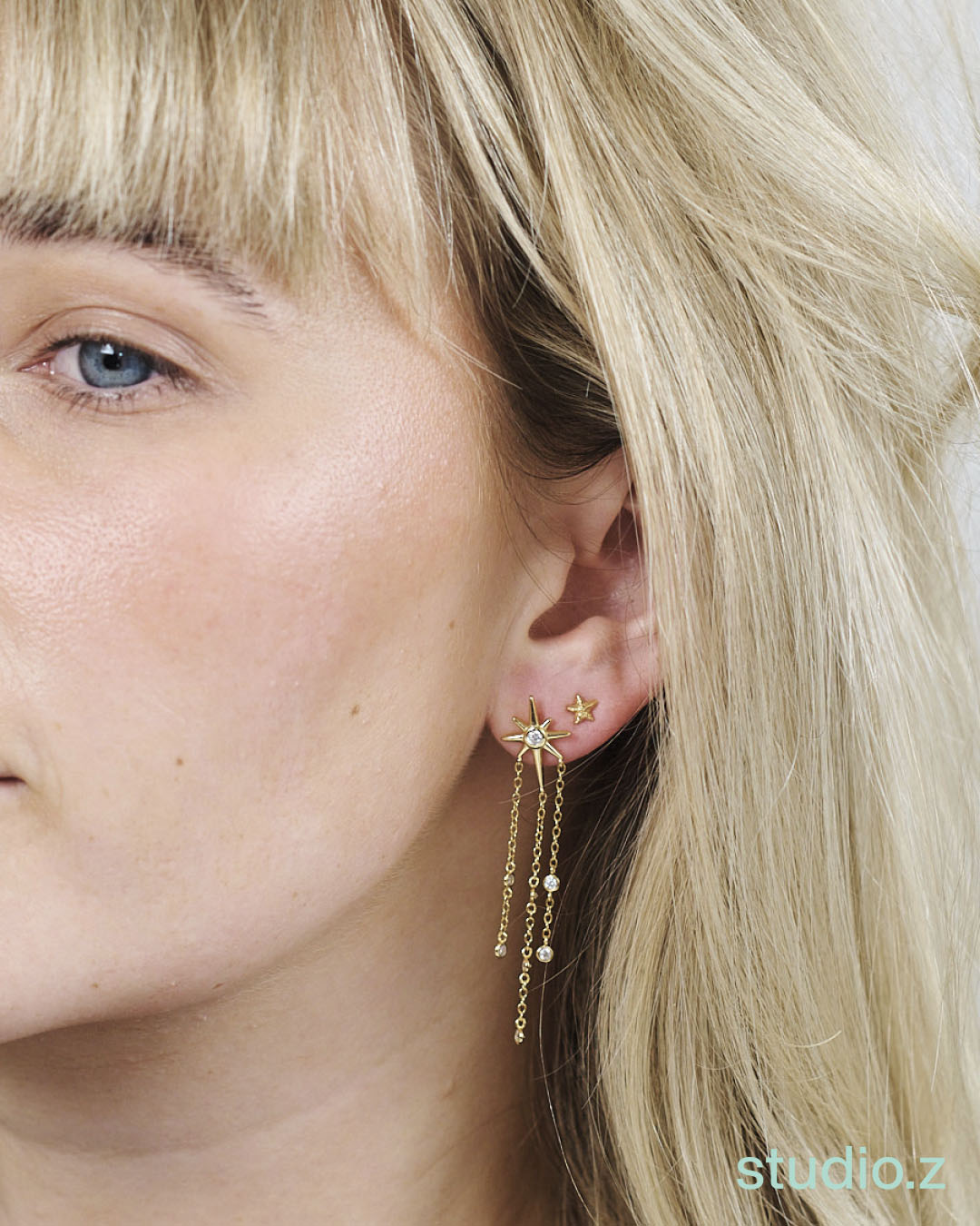 Twinkle Øreringe fra Studio Z er et elegant smykke, der tilføjer et strejf af glamour til enhver stil. Disse hængeøreringe er udført i forgyldt sterlingsølv, hvilket giver dem en luksuriøs og tidløs fornemmelse. De smukke kæder prydes af et delikat stjernemotiv, der fanger lyset på fineste vis og giver et subtilt, men iøjnefaldende look.