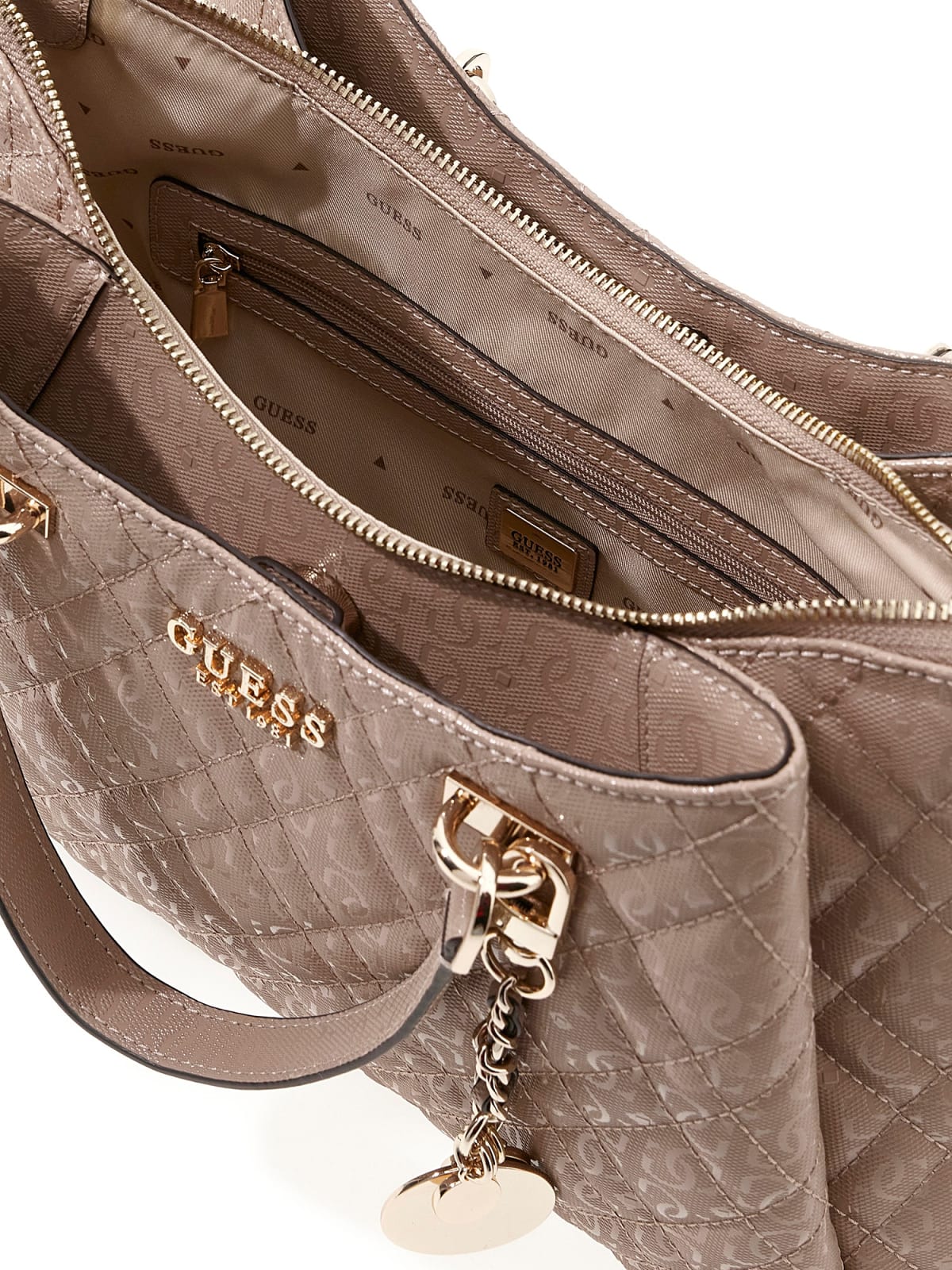 Tasken er udsmykket med guldfarvet hardware, der tilføjer et sofistikeret touch til det samlede udtryk. Den har en praktisk lynlåslukning, der sikrer dine ejendele, mens den indvendige lynlåslomme giver ekstra sikkerhed til mindre genstande såsom nøgler eller en mobiltelefon. Det stilfulde monogramprint gør tasken til et karakteristisk statement-piece, der nemt kan matches med forskellige outfits. Denne Guess håndtaske kombinerer funktionalitet og mode, hvilket gør den til et must-have for den stilbevidste kvinde.