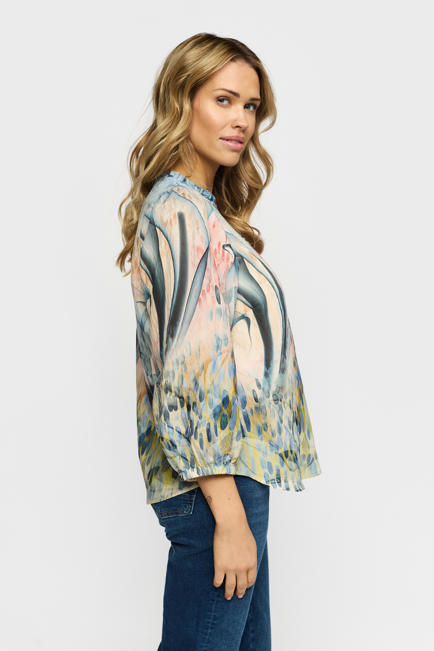 Oplev den elegante Johanna Bluse fra 2-Biz, der kombinerer stil med komfort på smukkeste vis. Denne bluse er designet med trendy 3/4-ærmer, som giver et moderne og alsidigt look, der passer perfekt til både hverdag og mere festlige anledninger. Med sin rundede halsudskæring med en delikat flæsekant tilføjer blusen et feminint touch, der fremhæver dit udtryk på en subtil måde. Blusens nøglehulsudskæring med knaplukning er ikke blot en praktisk detalje, men fungerer også som en elegant designelement, der tilføjer lidt ekstra til blusens overordnede æstetik. Det smukke print gør Johanna Blusen til et iøjnefaldende valg, som skaber liv og farve i enhver garderobe. Denne bluse har en almindelig pasform, der sikrer en behagelig bæreoplevelse uden at gå på kompromis med stil. Perfekt til både hverdagens udfordringer og festlige lejligheder.