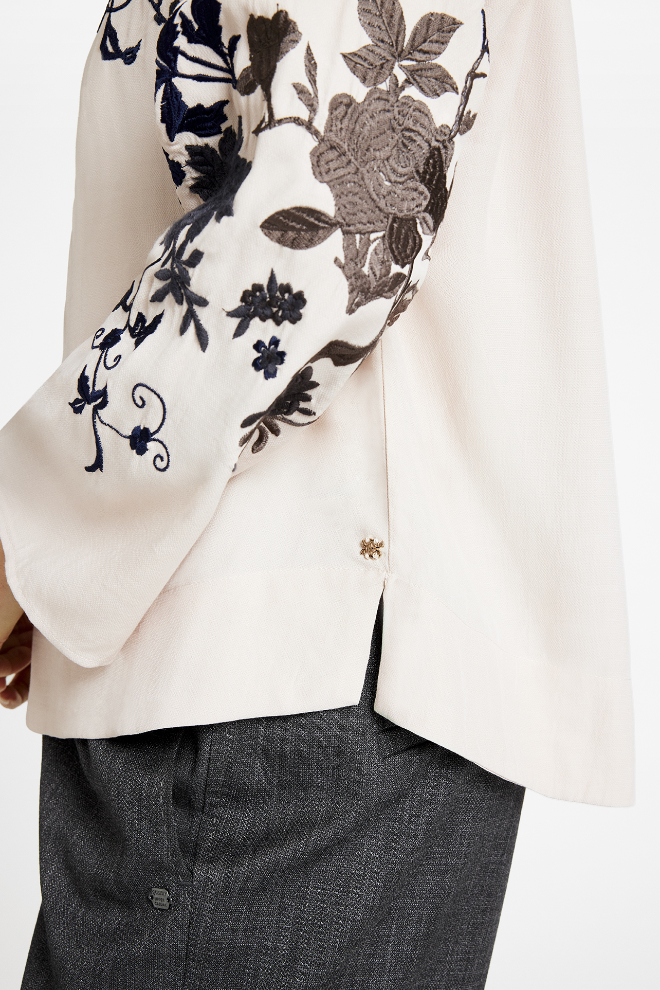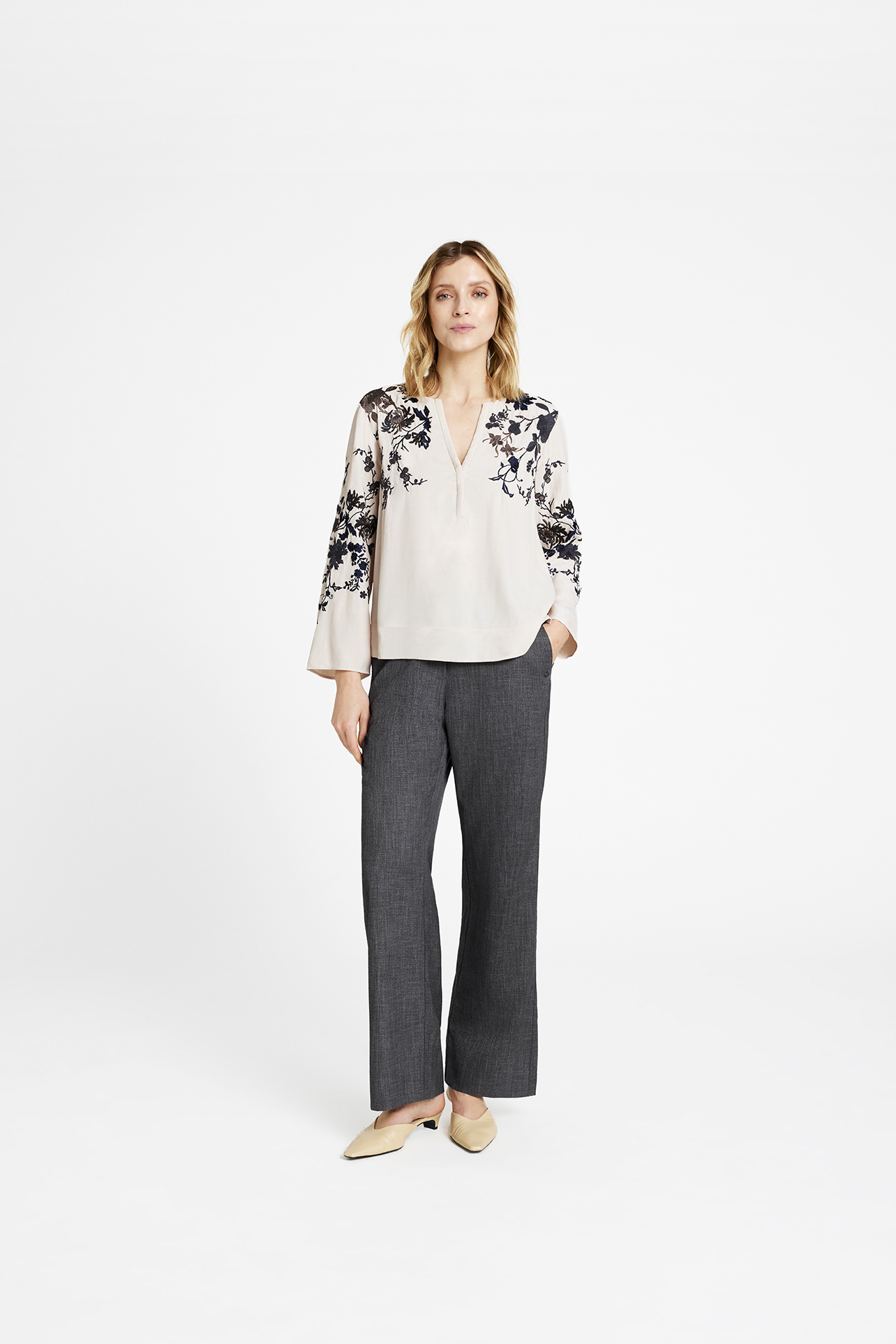 Naja Bluse fra Gustav er et udsøgt eksempel på elegant design og komfort, der passer perfekt ind i enhver garderobe. Denne langærmede bluse er skabt med et sans for detaljer, hvilket ses i den smukke V-udskæring, der tilføjer et feminint touch til blusens overordnede æstetik. Det broderede blomstermotiv giver et delikat og kunstnerisk præg, der skiller sig ud og tilføjer en unik charme. Blusen har en almindelig pasform, hvilket gør den både behagelig og flatterende at bære. En lille slids i siden bidrager til bevægelsesfriheden og understreger blusens lette og luftige fornemmelse. Naja Bluse fra Gustav er en alsidig tilføjelse, der kan styles både op og ned, hvilket gør den ideel til både hverdag og mere formelle anledninger.