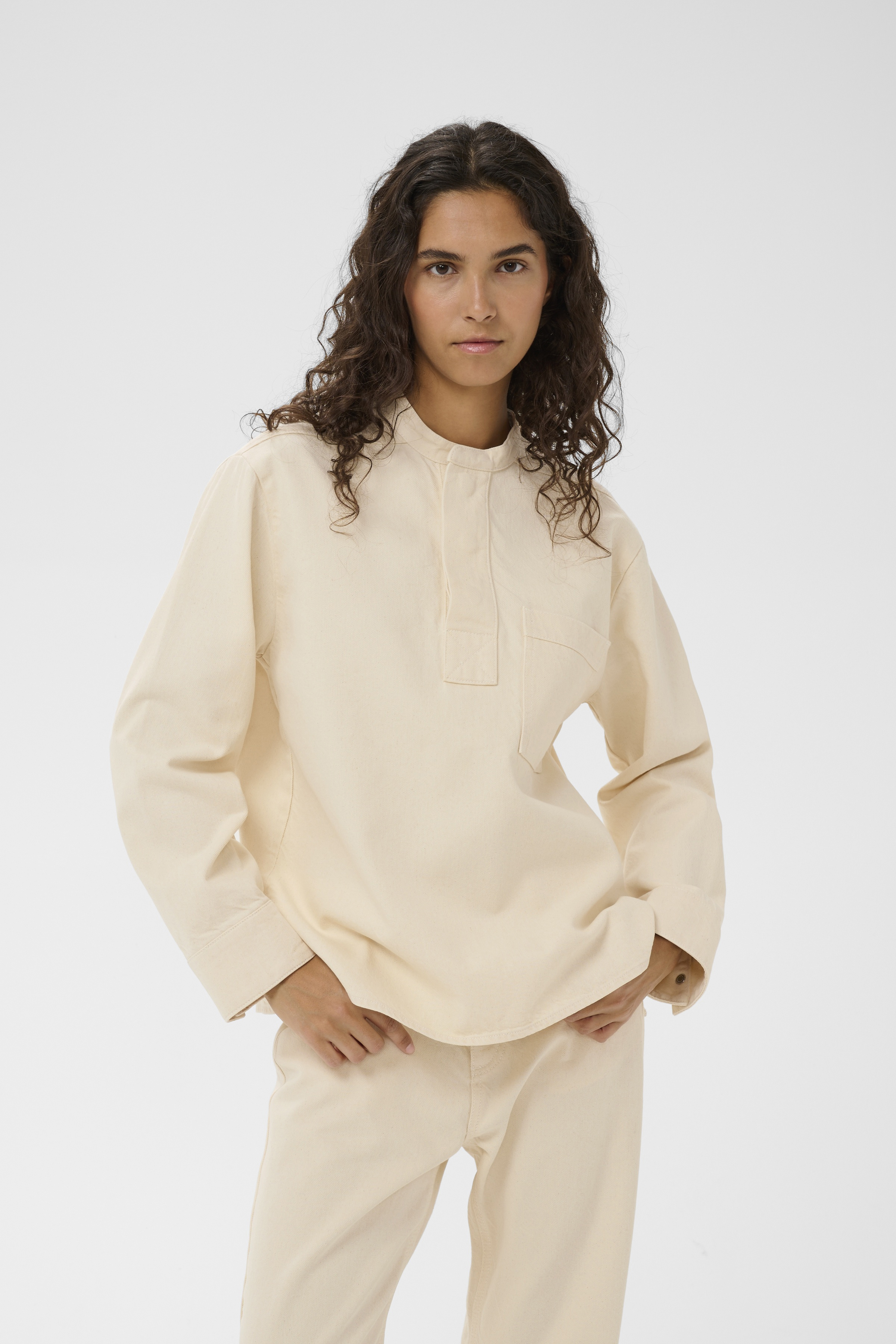 DilysIW Skjorte fra InWear kombinerer klassisk stil med moderne detaljer, og er det perfekte valg for dig, der ønsker både komfort og elegance. Skjorten er langærmet, hvilket gør den ideel til både kølige og varmere dage. En af de fremtrædende træk ved denne skjorte er kinakragen, der giver et minimalistisk og stilrent udtryk, mens den skjulte knaplukning ved halsen tilføjer en elegant finish.