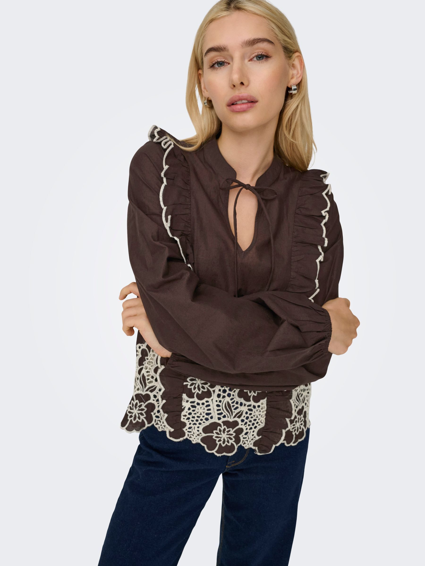 Holly Bluse fra JDY er den perfekte tilføjelse til din garderobe, hvis du søger en elegant og samtidig afslappet stil. Denne langærmede bluse udstråler en feminin charme med sit delikate blomsterbroderi, der tilføjer et sofistikeret touch til ethvert outfit. Med en V-hals, der har et stilfuldt bindebånd, tilbyder blusen en justerbar pasform, så du kan tilpasse udtrykket til både hverdag og mere formelle anledninger.
