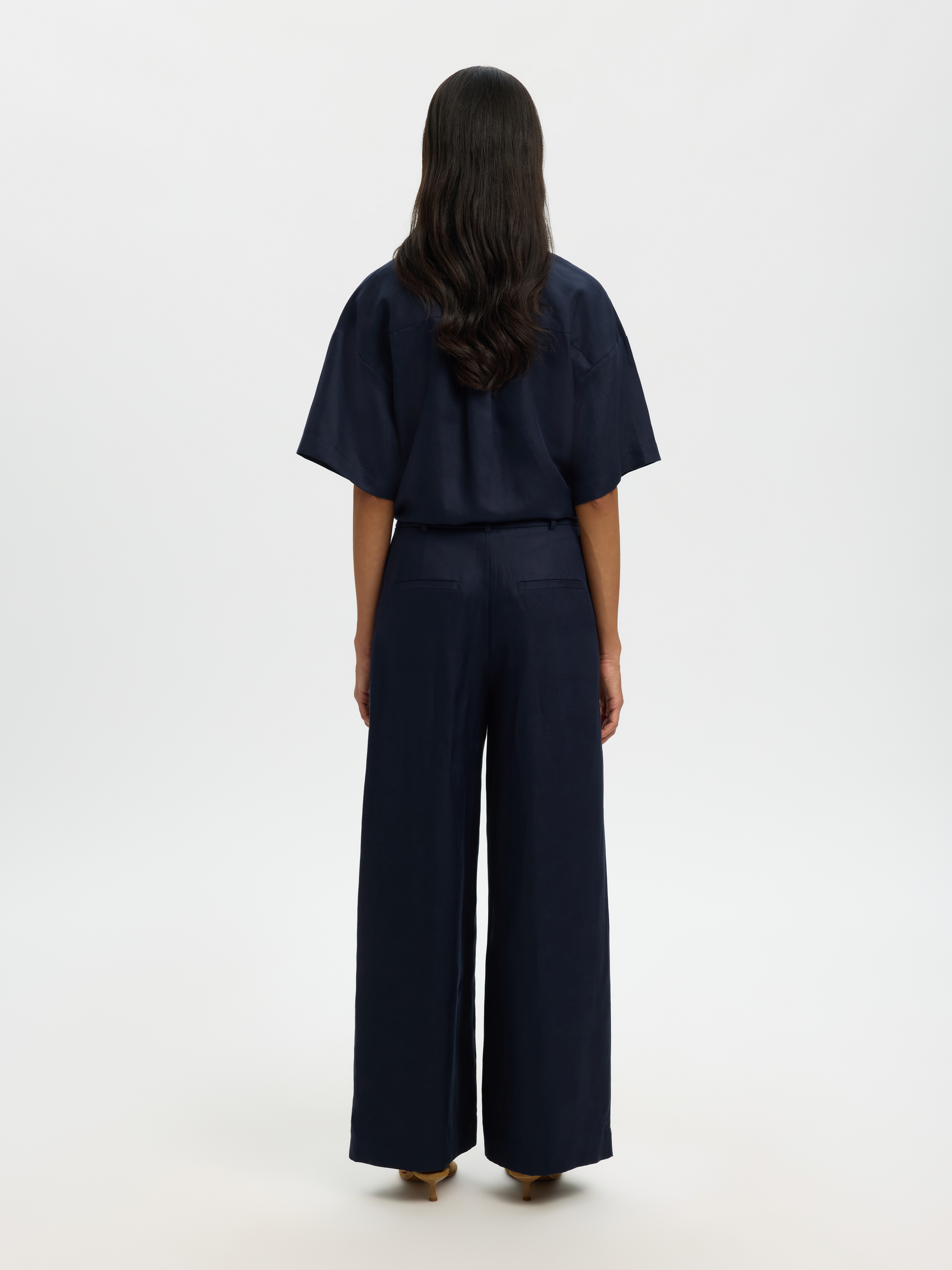 Bukserne er udstyret med en praktisk hægte- og lynlåslukning, som gør dem nemme at tage af og på. Materialeblandingen af lyocell og hør sikrer en let og åndbar fornemmelse, perfekt til både hverdag og formelle lejligheder. De praktiske lommer i siden giver plads til småting, og lægdetaljerne tilføjer et ekstra touch af raffinement. Lyra Wide Bukser er et must-have for den modebevidste kvinde, der værdsætter både stil og anvendelighed i deres beklædning.
