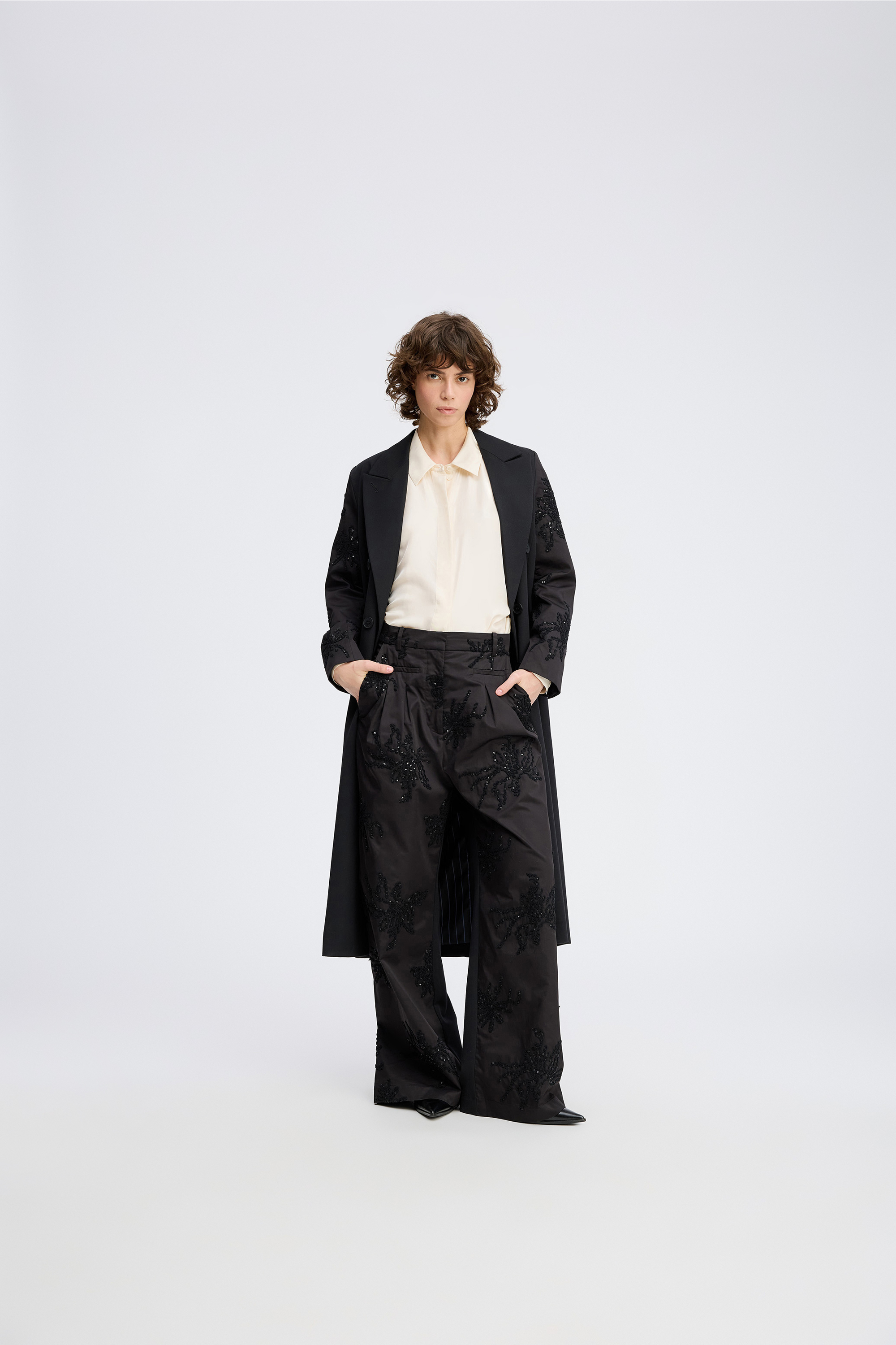 Stormy Bukser har en praktisk hægte- og lynlåslukning, som gør det nemt at tage dem af og på, og de inkluderer bæltestropper, så du kan tilføje et bælte for en endnu bedre pasform. Det broderede mønster med pailletter giver bukserne et unikt udseende, der skiller sig ud og tilføjer et strejf af glamour til ethvert outfit. Med lommer i siden er de også praktiske til hverdagens nødvendigheder. Disse bukser er ideelle til både afslappede og mere formelle anledninger, hvor du ønsker at gøre et imponerende indtryk.