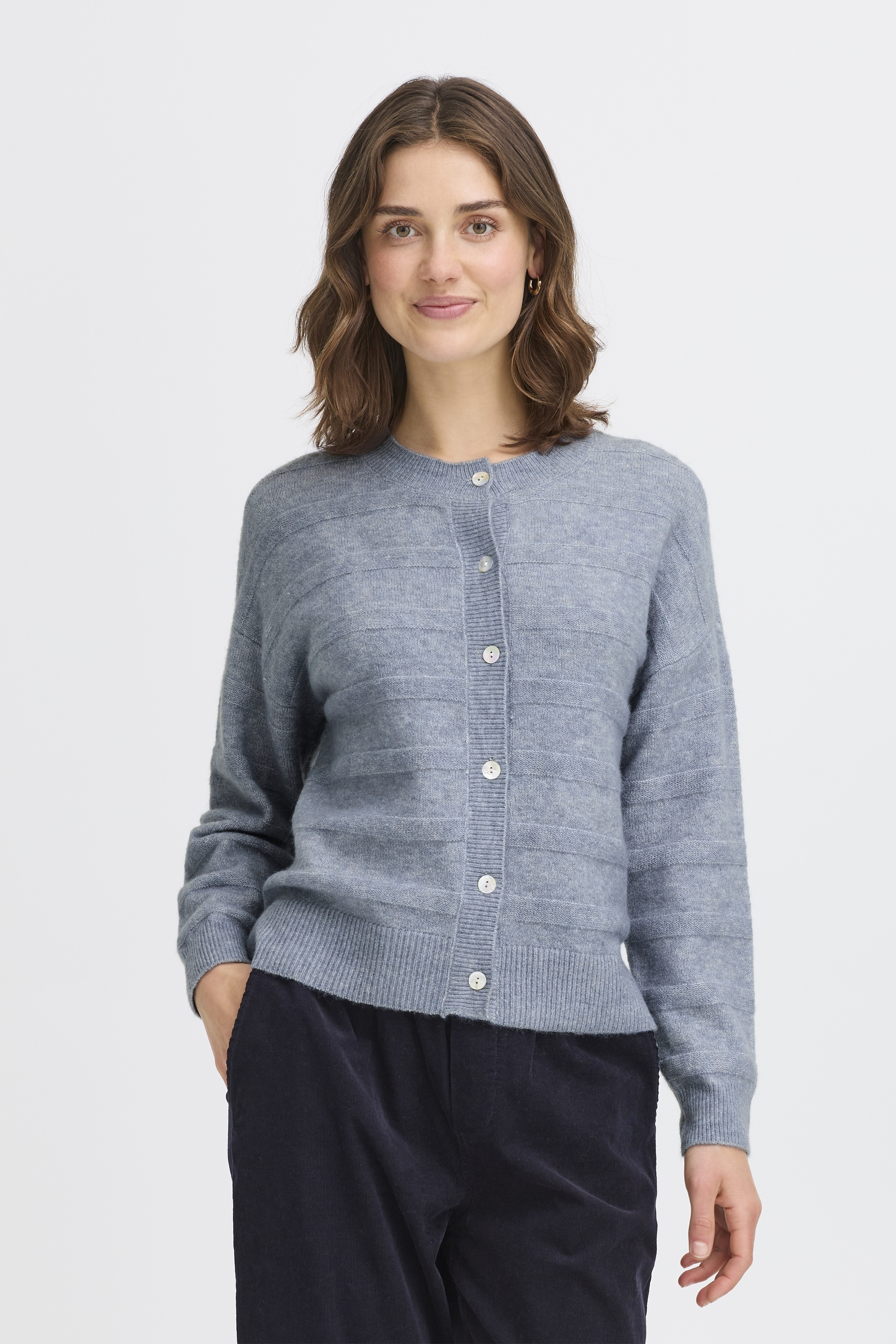 Cardiganen har ribstrikkede manchetter, der ikke kun sikrer en god pasform, men også tilføjer et subtilt designelement til den samlede stil. Med en rund halsudskæring og en almindelig pasform, passer Sanny Cardigan perfekt ind i både afslappede og mere formelle outfits. Denne cardigan er det ideelle valg til de køligere dage, hvor du stadig ønsker at bevare et sofistikeret udseende.