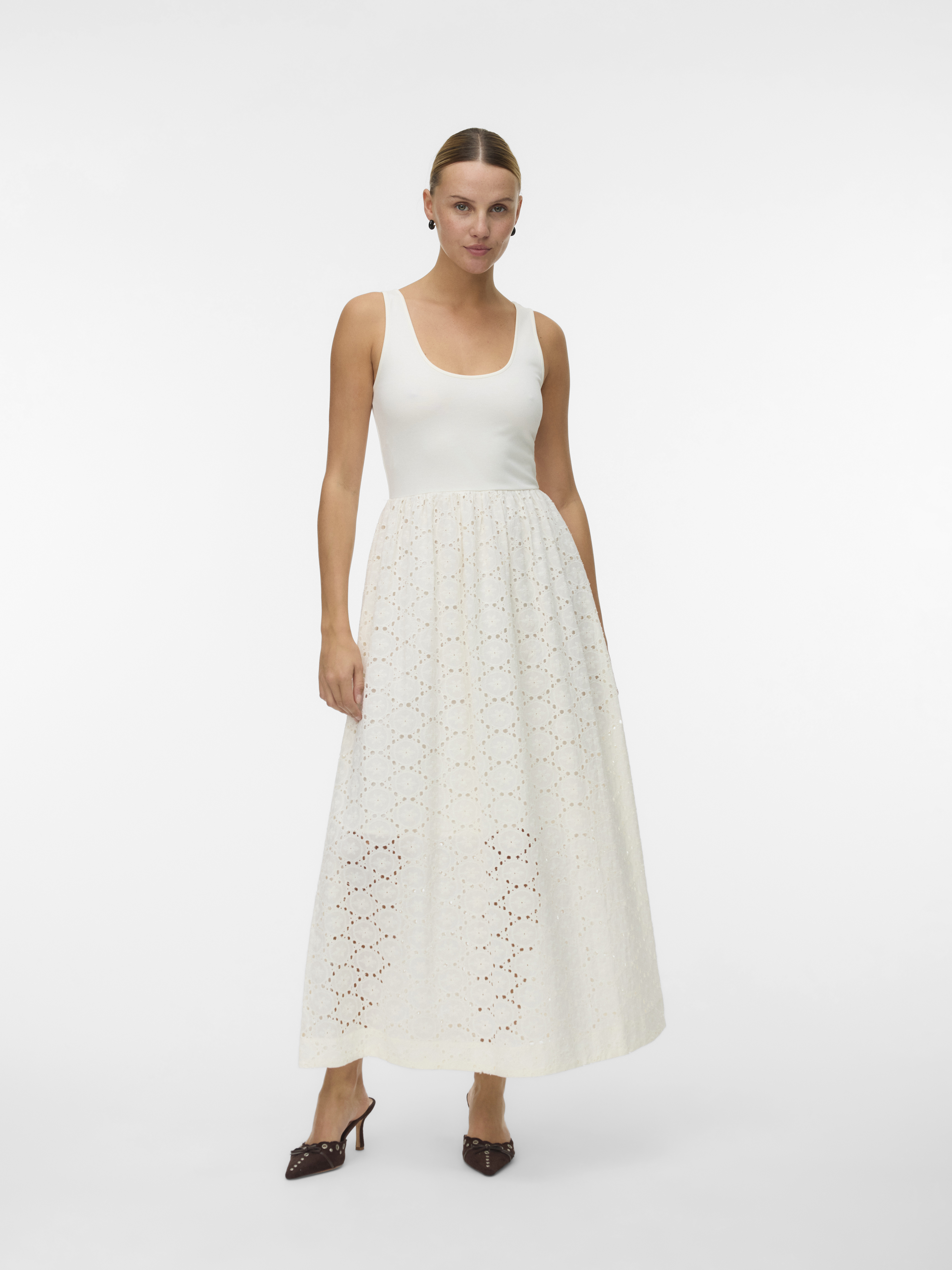 Oplev den elegante Bristol Kjole fra AWARE, der kombinerer stil og komfort på en unik måde. Denne kjole har en smuk rund hals, der tilføjer et klassisk touch, mens det ærmeløse design giver en let og luftig fornemmelse, perfekt til varmere dage. Overdelen er tætsiddende, hvilket fremhæver dine former på en flatterende måde, og skæringen i taljen sikrer en feminin silhuet.