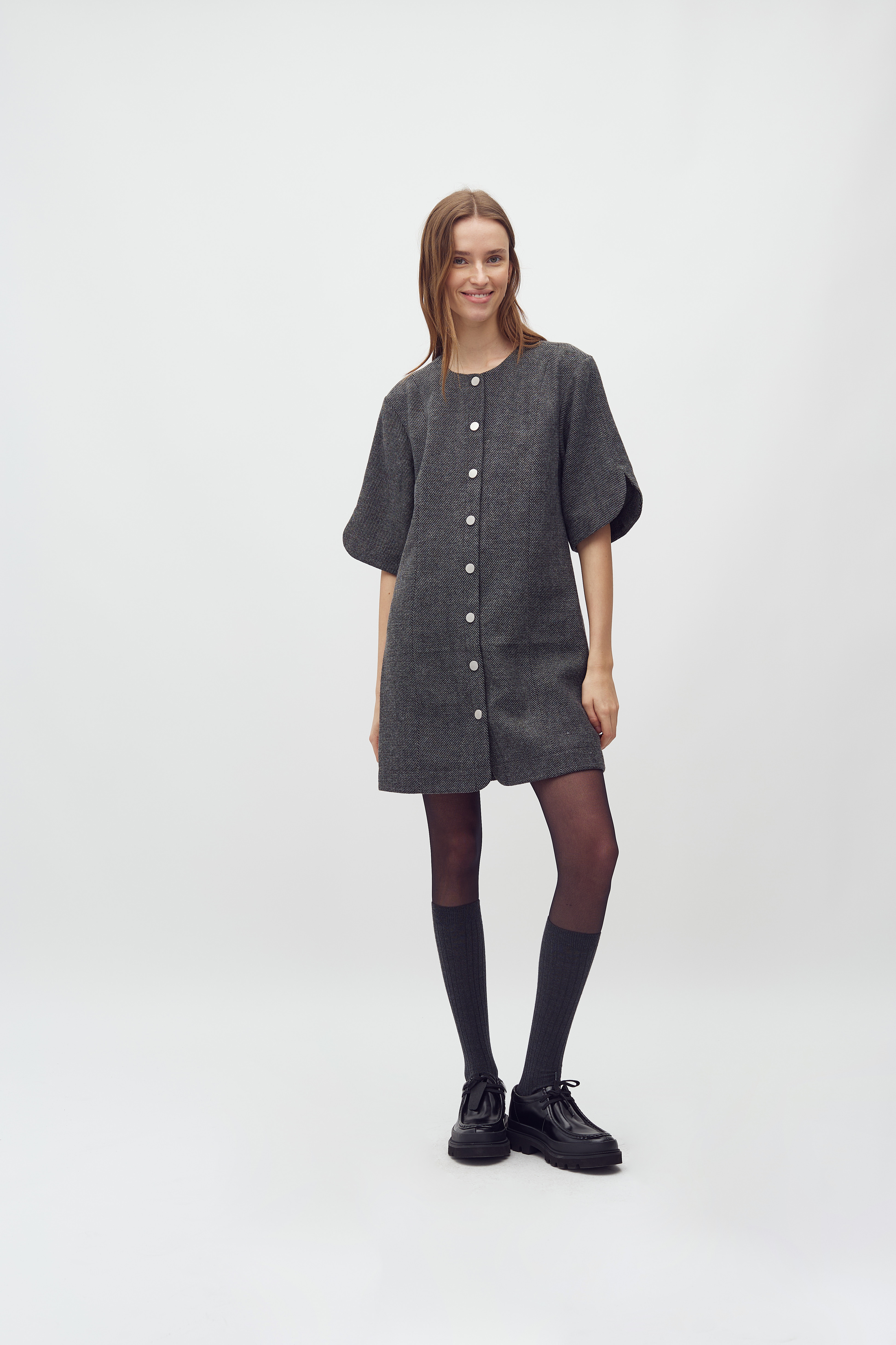 Denne kjole kombinerer moderne design med komfort og er perfekt til både hverdag og festlige begivenheder. Med sin mini-længde tilføjer den et ungdommeligt touch til din garderobe, mens det kortærmede design sikrer lethed og bevægelsesfrihed. Kjolens knaplukning i fronten giver et klassisk og tidløst udseende, der nemt kan styles op eller ned efter anledningen. Den runde hals tilfører en enkel elegance. Med en afslappet pasform, der smyger sig behageligt om kroppen, kan du være sikker på komfort hele dagen. Uanset om du bærer den med stilfulde sneakers til en afslappet dag ude, eller med stiletter til en aften i byen, vil Baomino-M kjolen fra mbyM være et alsidigt og elsket valg i din garderobe.