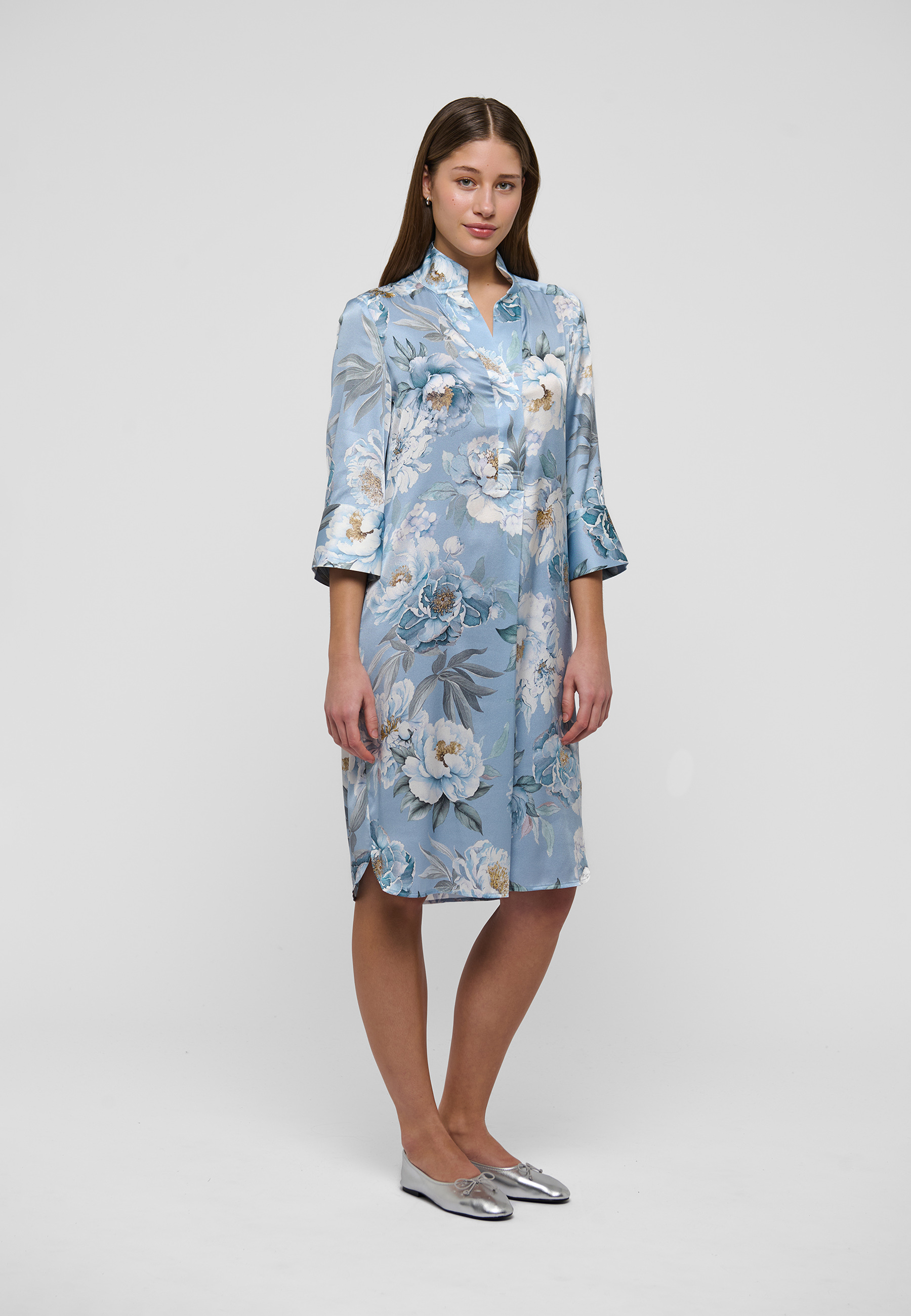 Oplev den elegante KamillesDEA kjole fra Dea Kudibal, som forener tidløs stil med moderne detaljer. Denne kjole har en smuk V-udskæring, der fremhæver halsudskæringen på en sofistikeret måde. De 3/4-ærmer giver et stilfuldt look og tilbyder samtidig en god balance mellem komfort og elegance. Kjolens knælange design gør den alsidig og velegnet til både formelle og uformelle anledninger. KamillesDEA kjolen er udformet i silkemateriale, der føles blødt og luksuriøst mod huden. Det elegante blomsterprint giver kjolen et feminint og forfriskende udtryk, der skiller sig ud. Med sin almindelige pasform og opretstående krave leverer kjolen en klassisk silhuet. Manchetterne med knaplukning tilføjer en ekstra detalje, der fuldender det samlede look. Denne kjole fra Dea Kudibal er et must-have til enhver garderobe, hvor den vil bringe et strejf af elegance og stil til din hverdag.