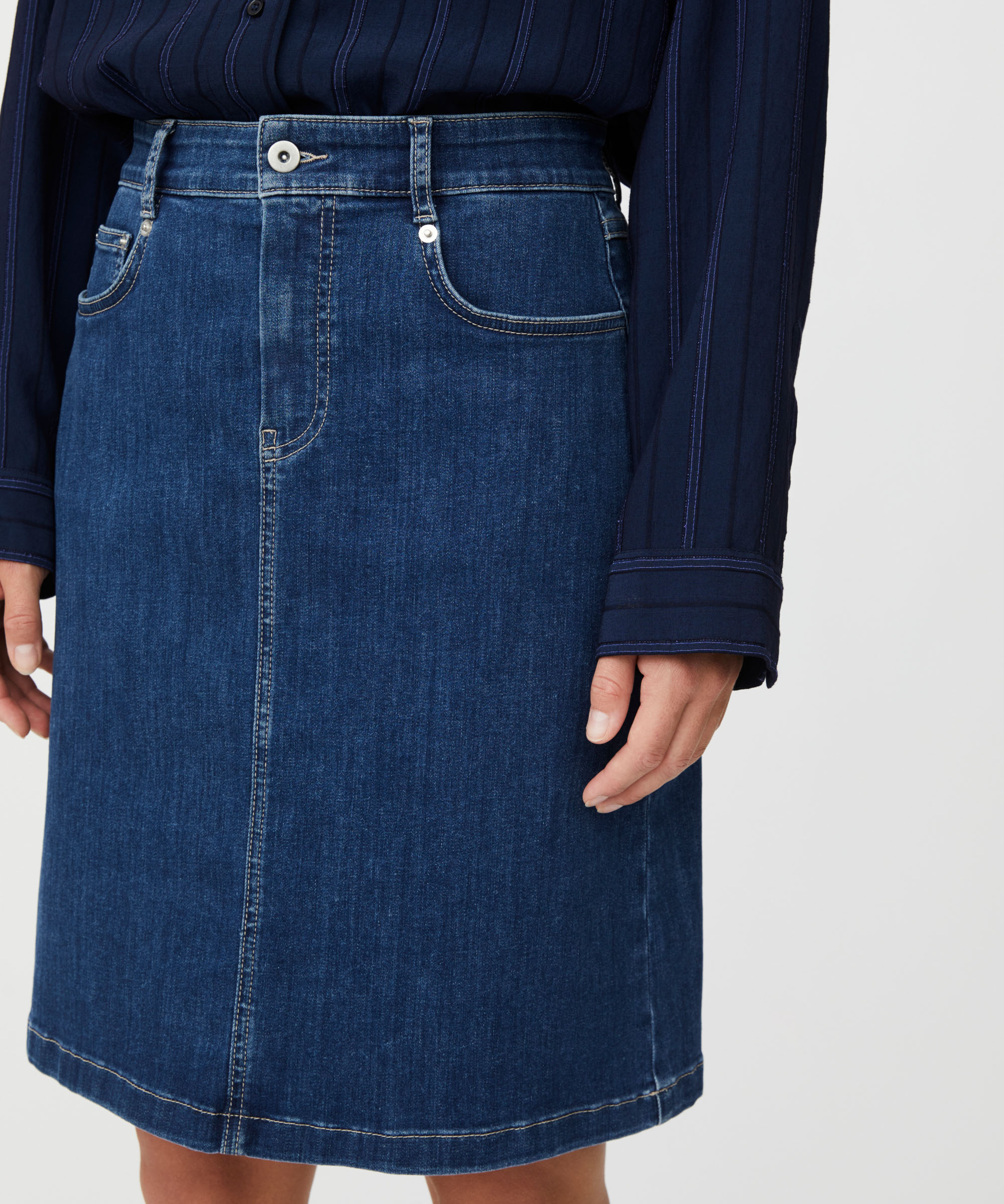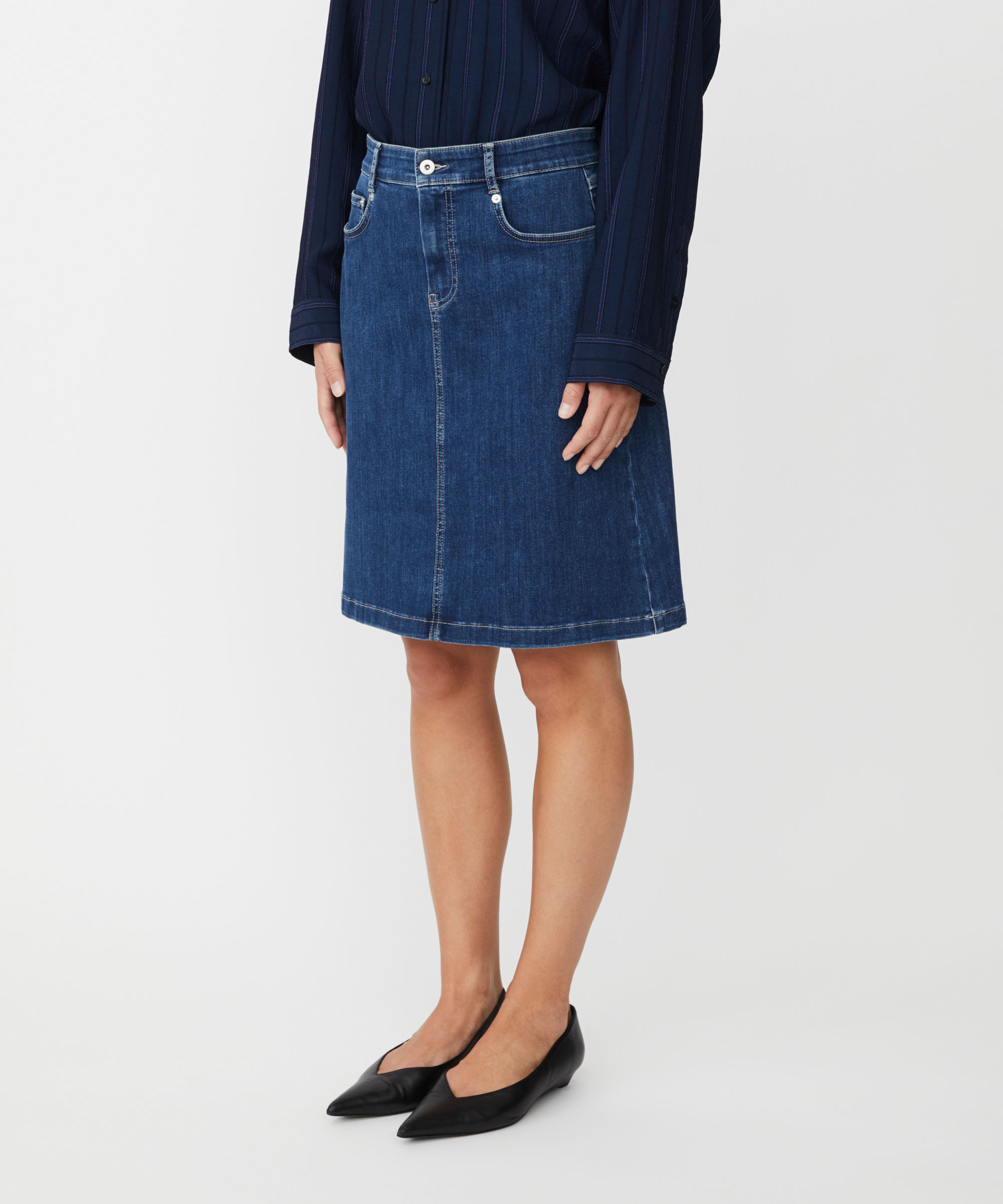 Seravine Nederdel fra Masai er den perfekte kombination af stil og komfort, ideel til både hverdagsbrug og mere formelle anledninger. Denne denimnederdel er designet til at nå knæet, hvilket giver et elegant og sofistikeret look. Med sine praktiske knap- og lynlåslukninger er den nem at tage af og på, hvilket gør den yderst praktisk.