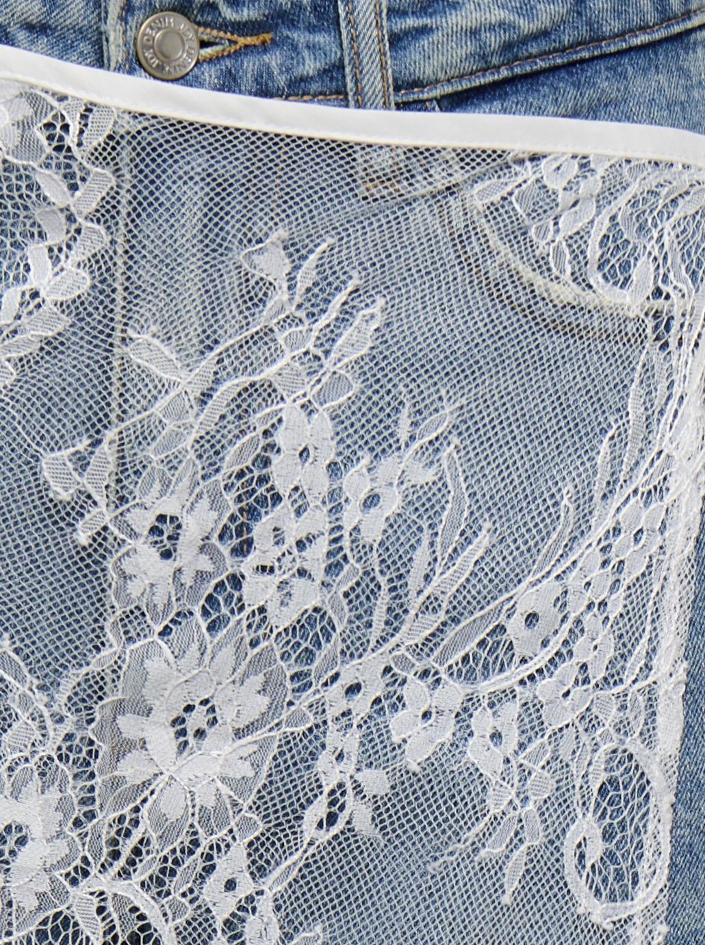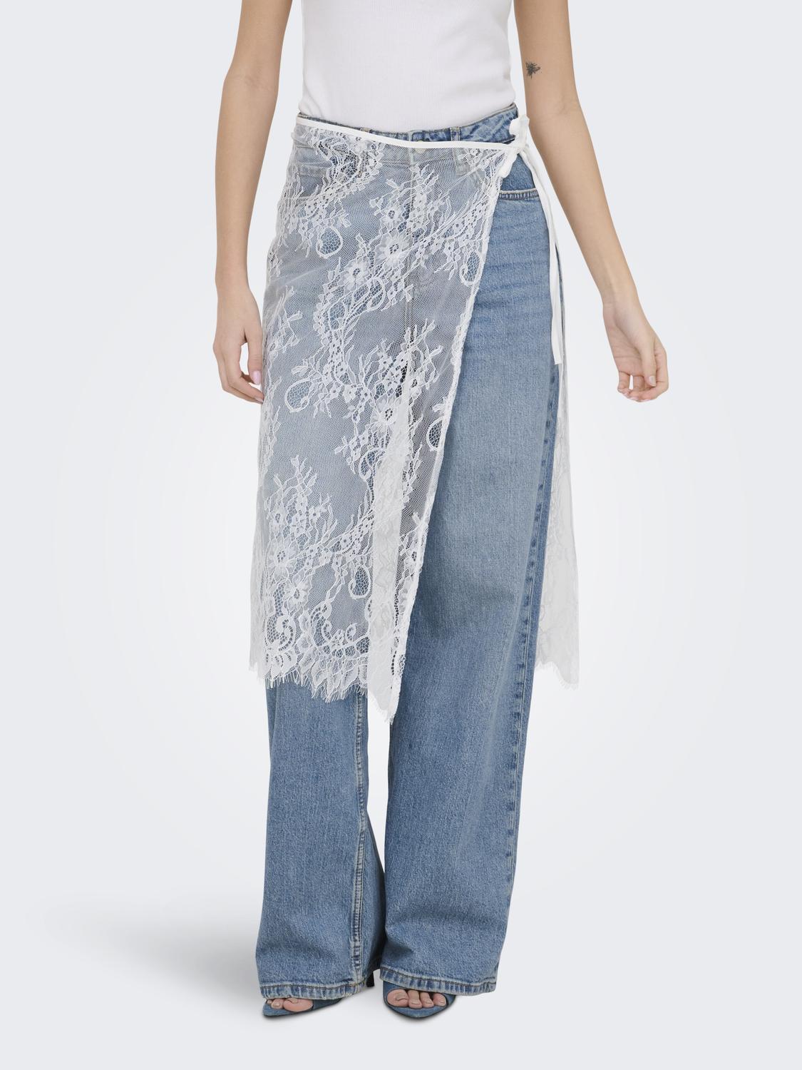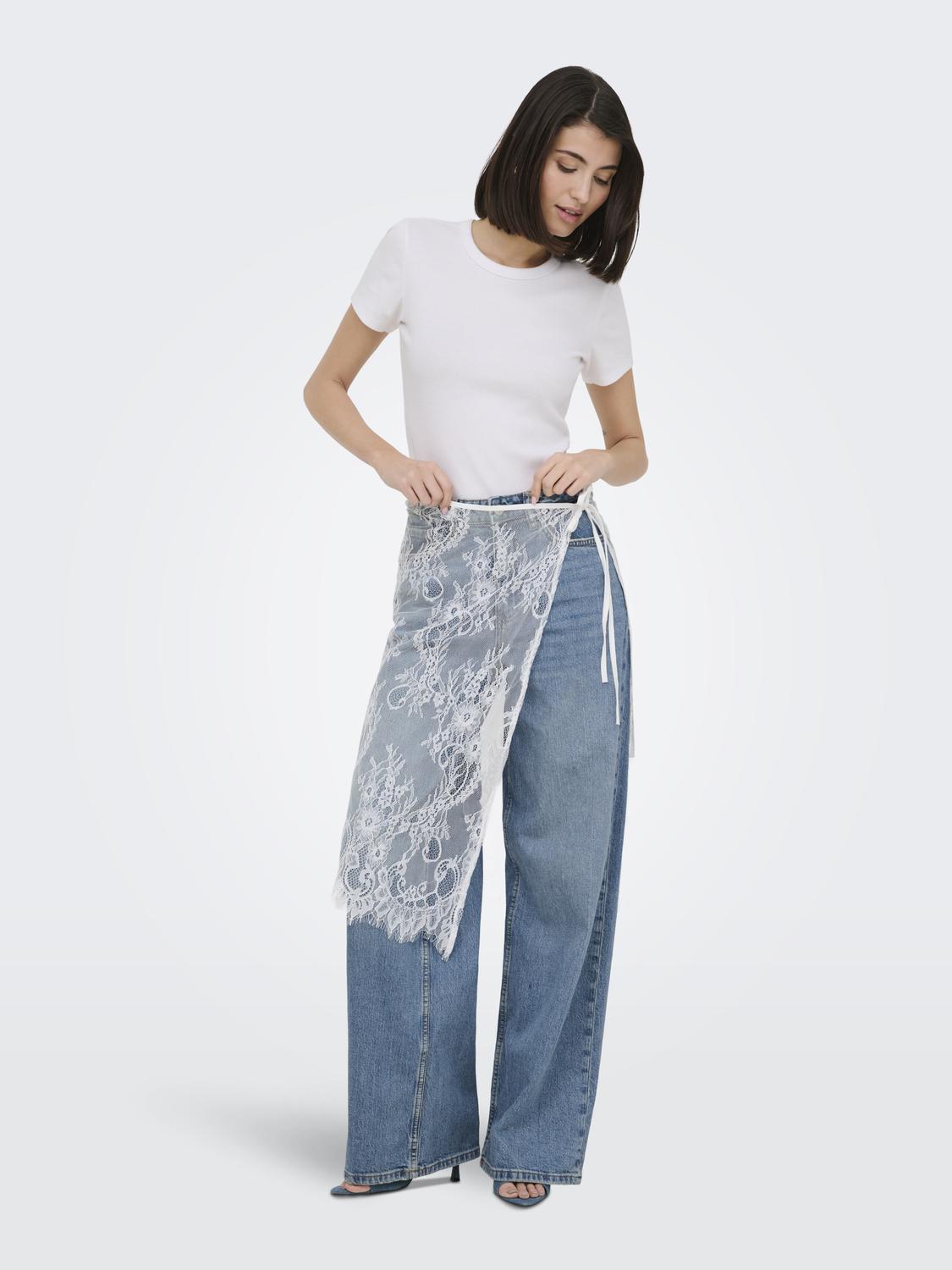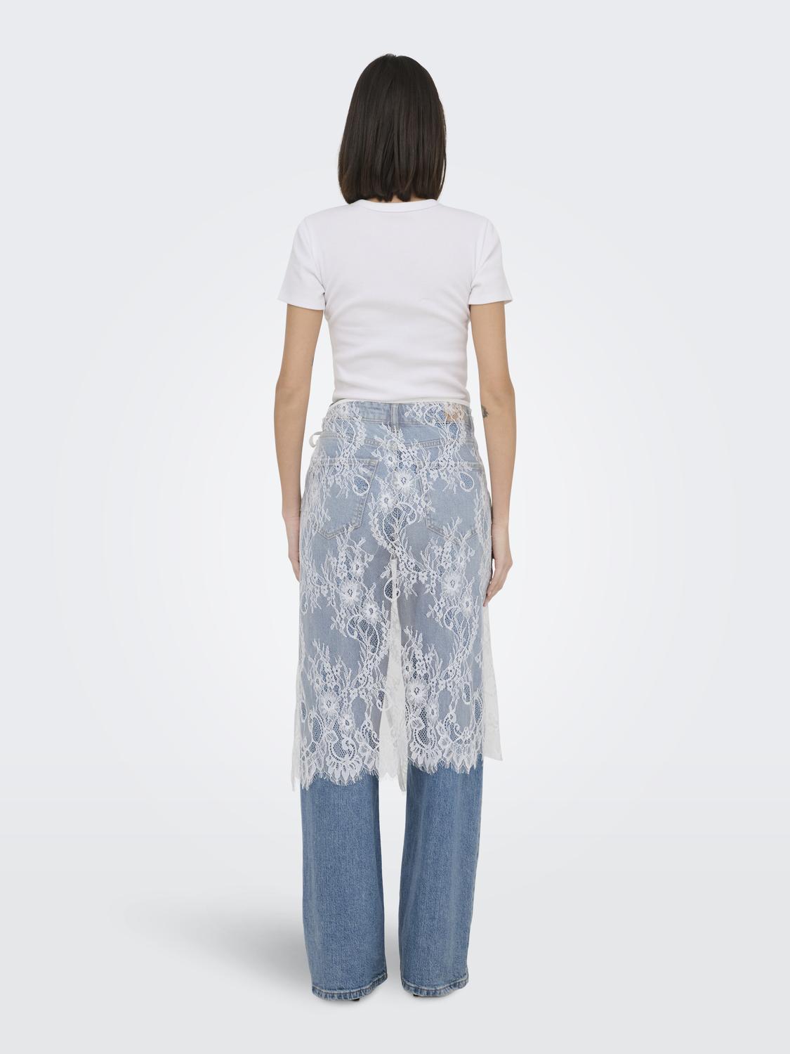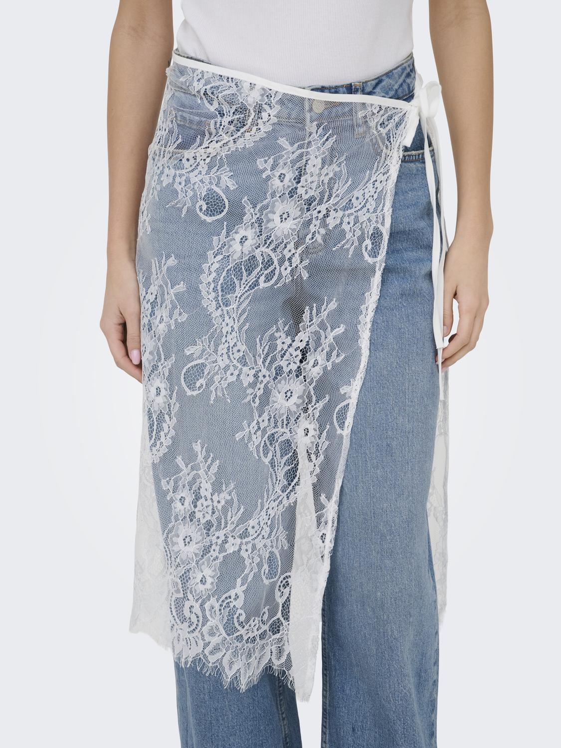 Den elegante blomsterblonde, der pryder nederdelen, tilfører et klassisk og romantisk element, som nemt kan føre dig fra dag til aften. Blonderne er smukt integreret i designet og understreger nederdelens feminine charme. Det asymmetriske snit skaber en dynamisk silhuet, der tilføjer et moderne twist til det ellers tidløse design. Dette gør nederdelen til et alsidigt stykke tøj, der kan bæres ved mange lejligheder.
