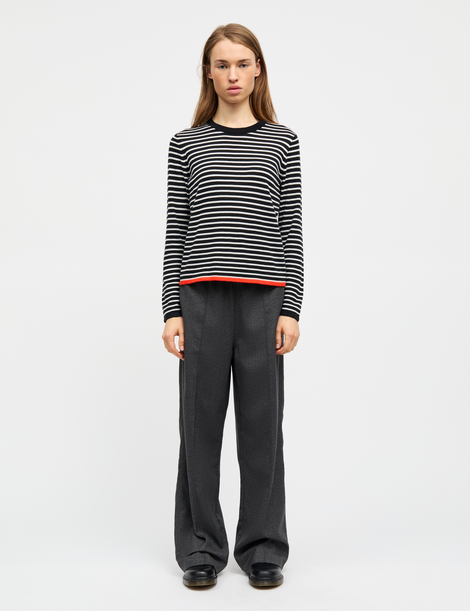 Fine Merino Ivy Striktrøje fra Mads Nørgaard er et stilfuldt valg til enhver garderobe. Denne striktrøje er skabt med fokus på både design og komfort, hvilket gør den ideel til både hverdag og særlige lejligheder. Den finmaskede strik giver en let og behagelig følelse, mens den runde halsudskæring tilføjer et klassisk touch, der aldrig går af mode. Trøjen er langærmet, hvilket gør den perfekt til at holde dig varm på køligere dage. Et særligt kendetegn ved denne striktrøje er den kontrastfarvede kant i bunden, der giver et moderne twist og bryder de traditionelle striber på en elegant måde. Materialet består af en merinouldblanding, der sikrer både blødhed og holdbarhed, hvilket gør trøjen til en perfekt tilføjelse til din vintergarderobe.