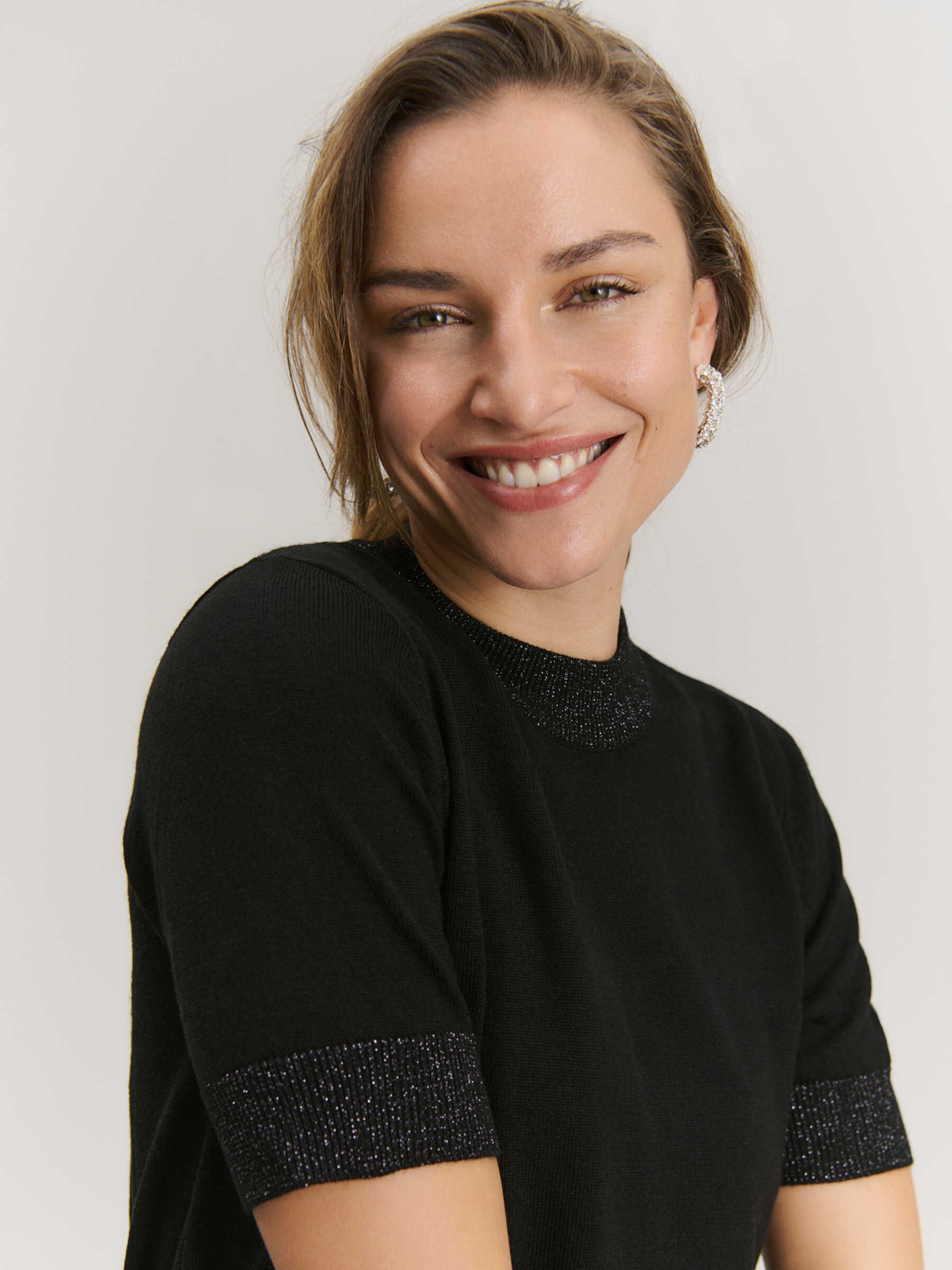 En særlig detalje ved denne bluse er ribkanten med glimmer, der tilfører et strejf af luksus og gør den ekstra iøjnefaldende. Materialet er fremstillet med merinould, som ikke kun giver en blød og behagelig følelse mod huden, men også sikrer, at blusen holder formen over tid. Den almindelige pasform gør, at den sidder flot på kroppen, samtidig med at den giver en god bevægelsesfrihed. Valencia Merino Wool Strikbluse kombinerer stil og komfort på en enestående måde, og er et must-have for dem, der værdsætter kvalitet og elegant design.