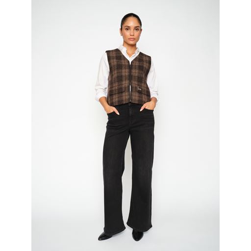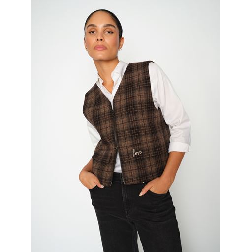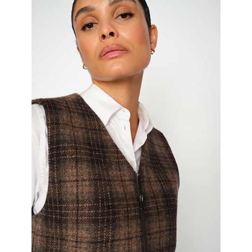 Runa Chez Vest fra Mos Mosh er en elegant tilføjelse til enhver garderobe, der kombinerer klassisk design med moderne stil. Denne vest er fremstillet af 100% uld, hvilket sikrer både varme og komfort, ideel til de køligere årstider. Med en praktisk lynlåslukning foran, er det let at tage vesten af og på, samtidig med at den giver et stilrent look. Det karakteristiske ternede mønster tilføjer et sofistikeret præg, der gør vesten velegnet til både hverdagsbrug og mere formelle anledninger. De dekorative lommer foran tilfører et raffineret touch og bryder den ellers enkle stil, mens den almindelige pasform sikrer en behagelig og flatterende silhuet. Med Runa Chez Vest fra Mos Mosh kan du nemt skabe et lag-på-lag look, der både er funktionelt og moderigtigt.