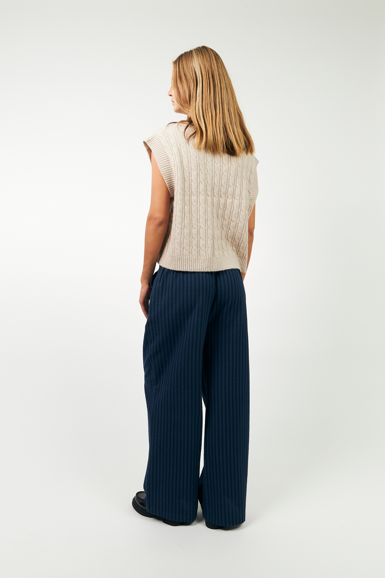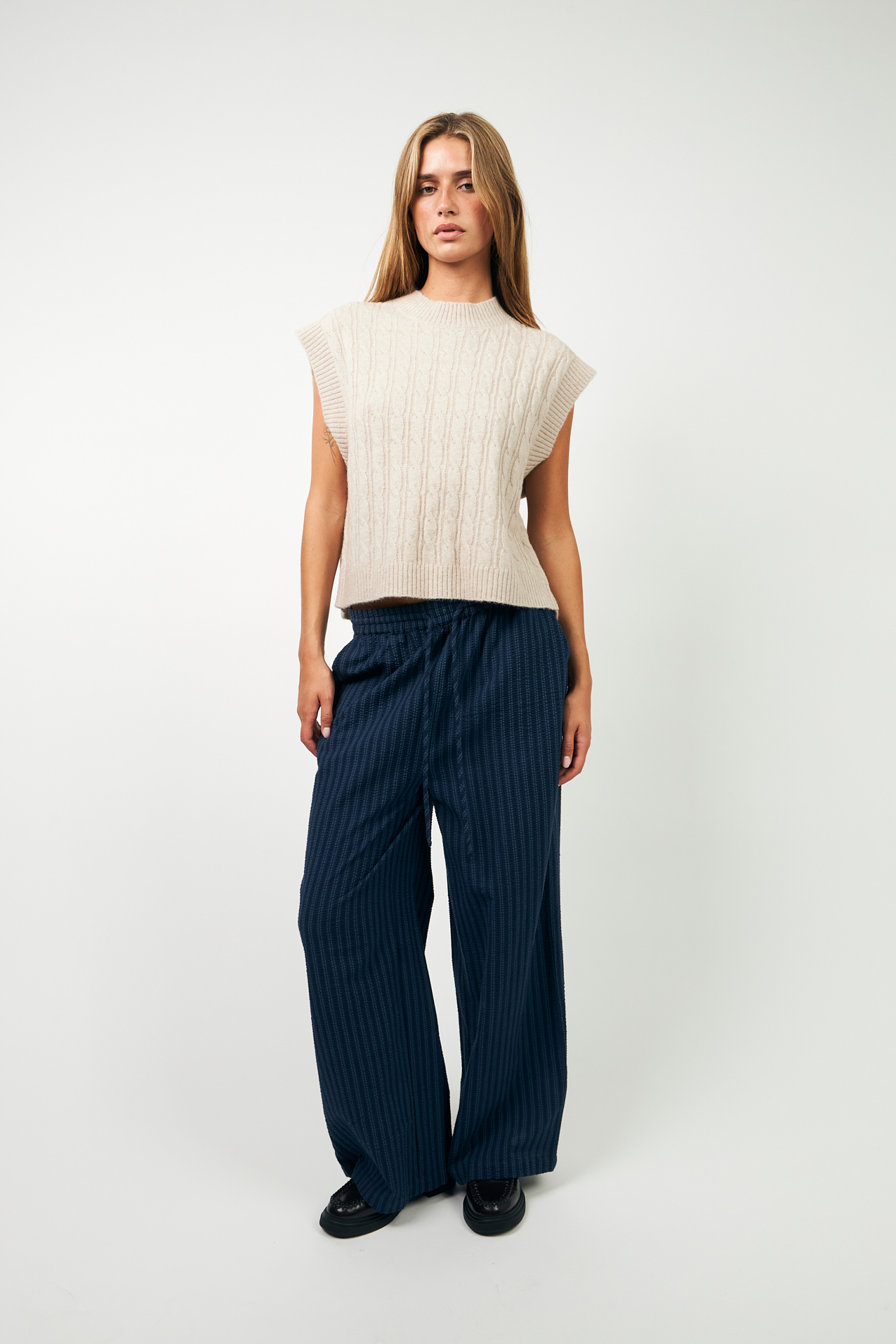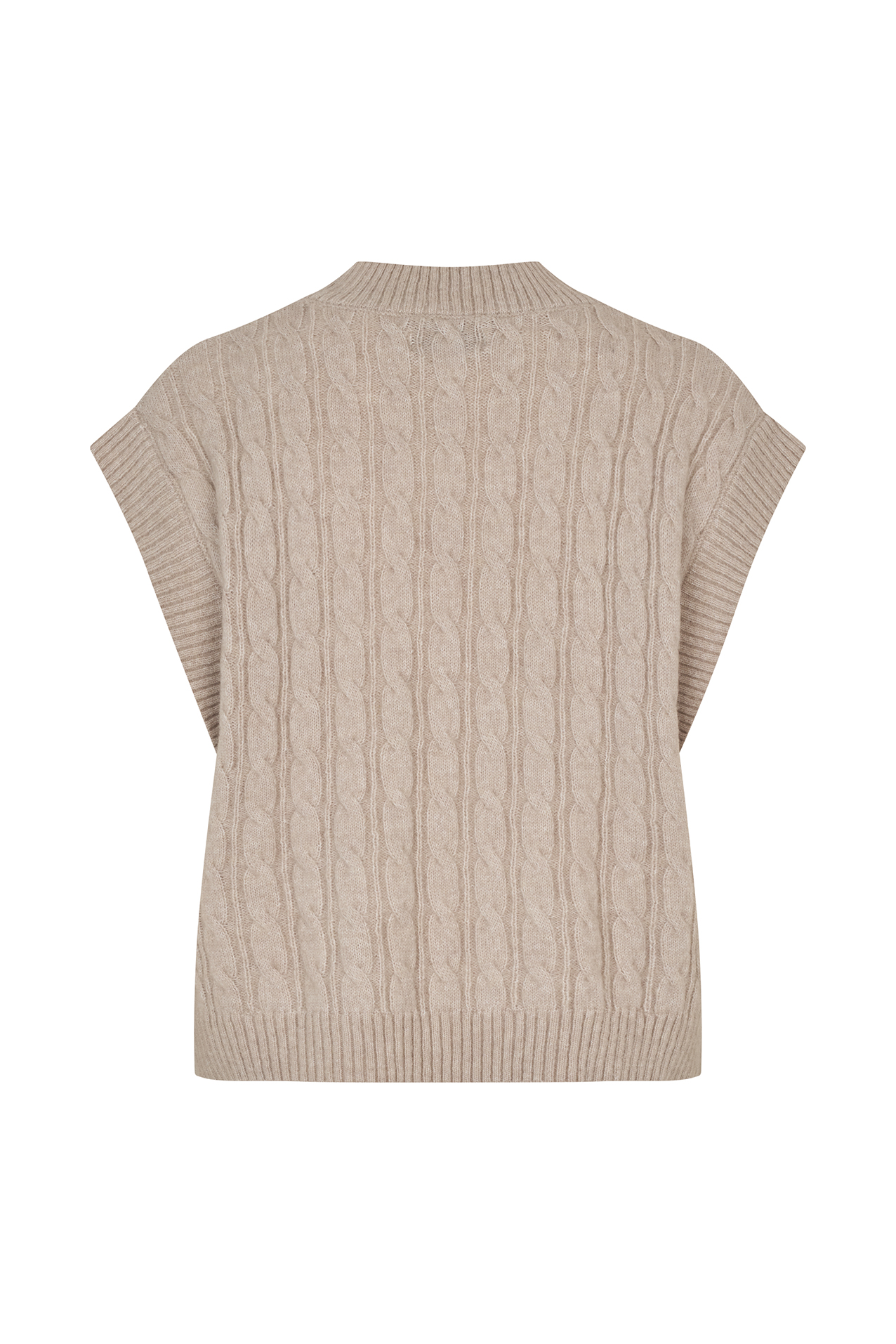 FinnLL Vesten er udført i et elegant kabelstrikmønster, der tilfører struktur og dybde til designet. Ribkanten sikrer en behagelig pasform, der sidder flot og giver lidt ekstra stil til dit outfit. Med sin almindelige pasform er vesten let at bære over skjorter eller bluser, og kan nemt kombineres med dine yndlingsbukser eller nederdele for et afslappet, men stilfuldt look. Denne vest er et alsidigt stykke tøj, der passer perfekt ind i både efterårs- og vintergarderoben.