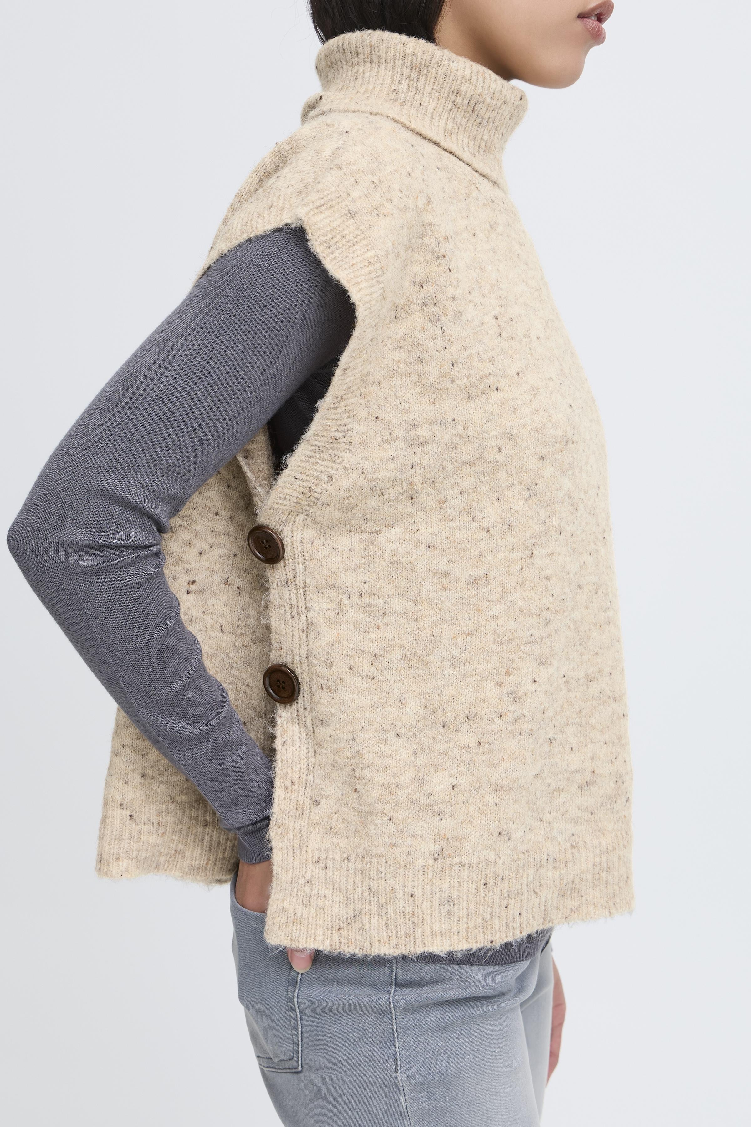 Oplev den stilfulde og alsidige "Lotus Strikponcho" fra Ichi, der kombinerer komfort med et moderne design. Denne elegante strikponcho er det perfekte valg, når du ønsker en beklædning, der både kan holde dig varm og se godt ud på køligere dage. Med dens ærmeløse design og rullekrave giver den et sofistikeret look, der er let at style over en langærmet bluse eller kjole.