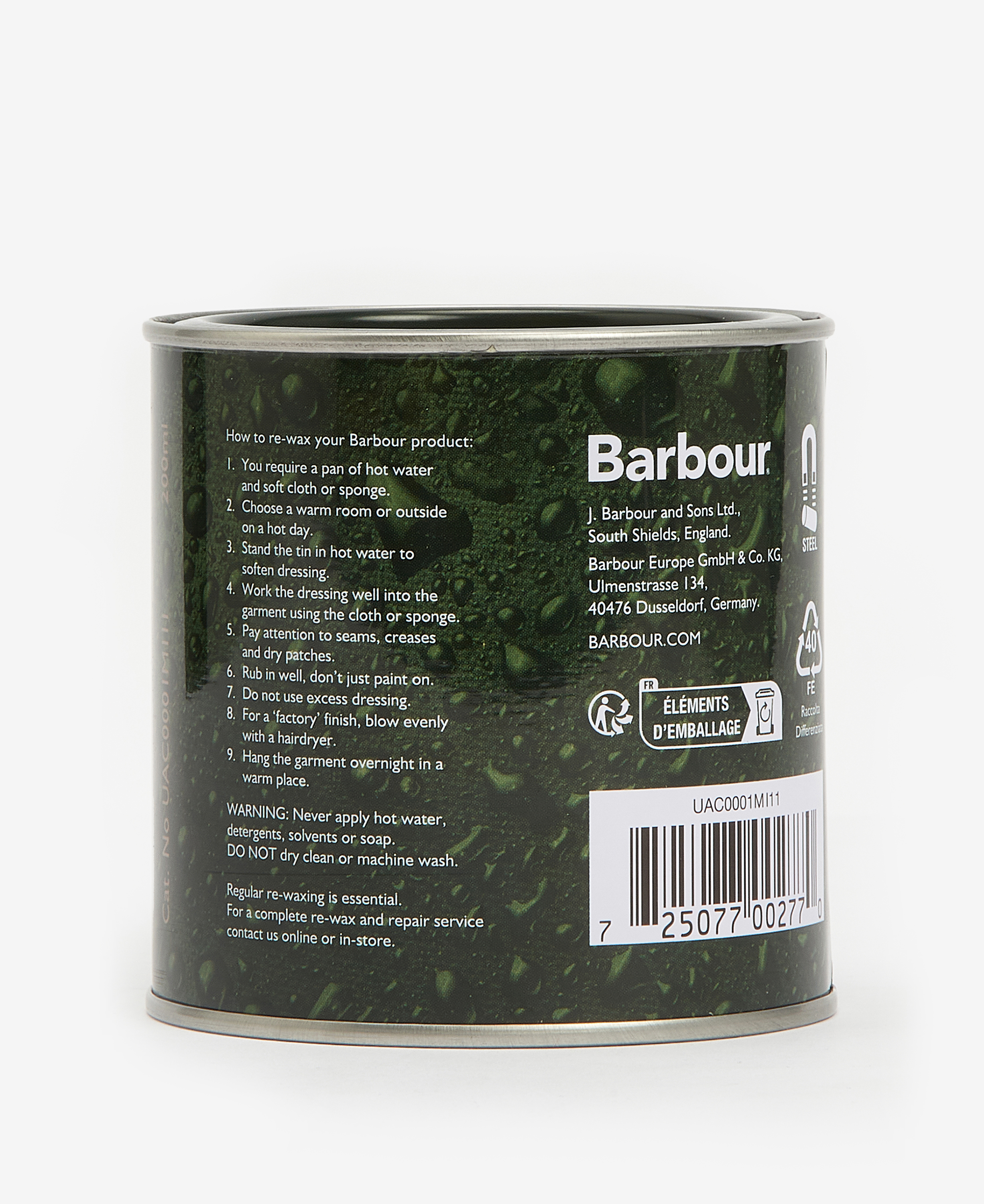 Barbour Thornproof Dressing Voks er det ideelle plejemiddel til vedligeholdelse af dine oilskins-Barbour-jakker. Denne voks er specielt designet til at genoprette den vejrbestandige funktion i din jakke, så du kan nyde dens beskyttende egenskaber i lang tid. Ved regelmæssig brug af dette produkt kan du effektivt beskytte din jakke mod elementerne og forlænge dens levetid samt bevare dens udseende og funktionalitet.