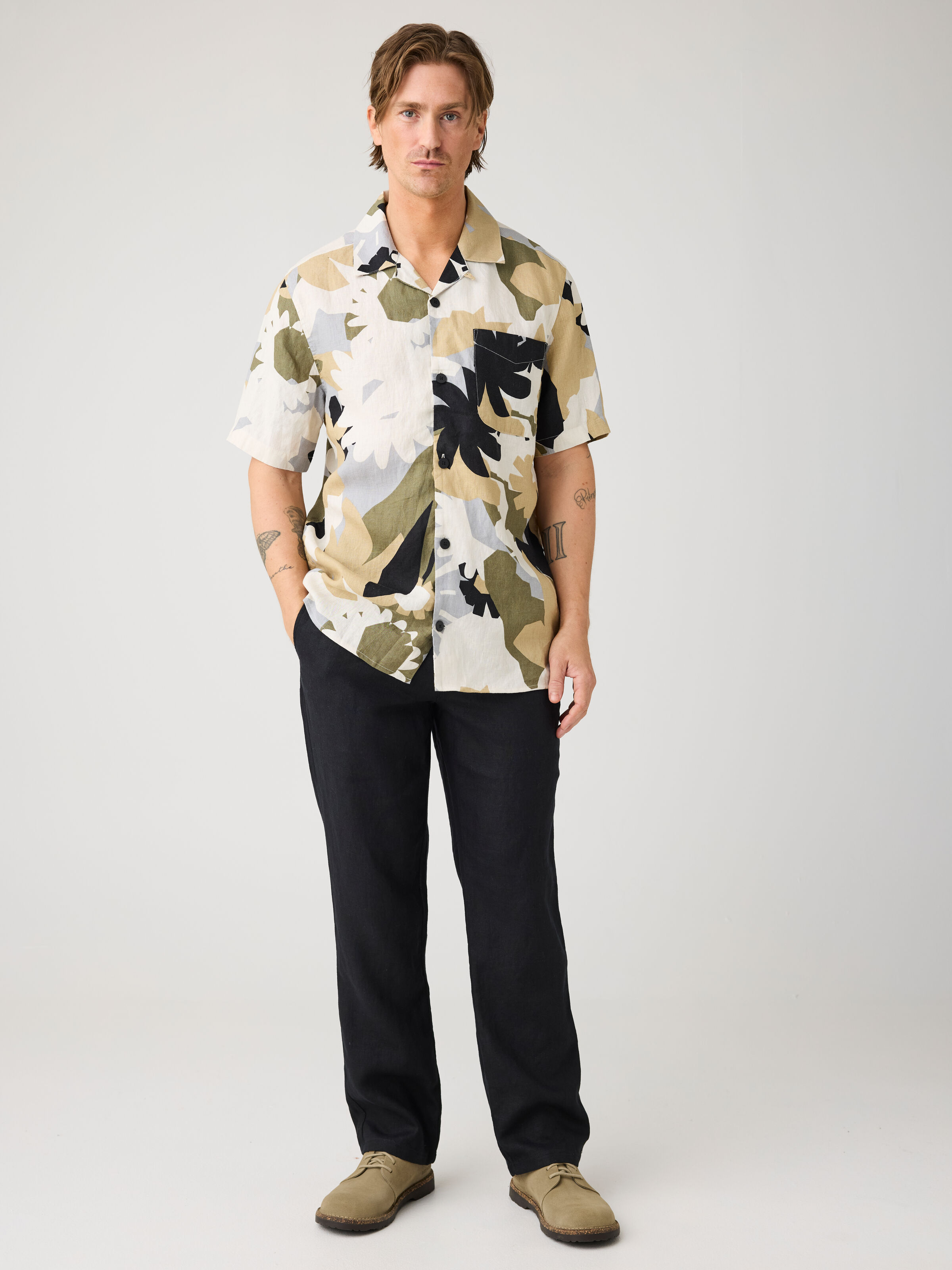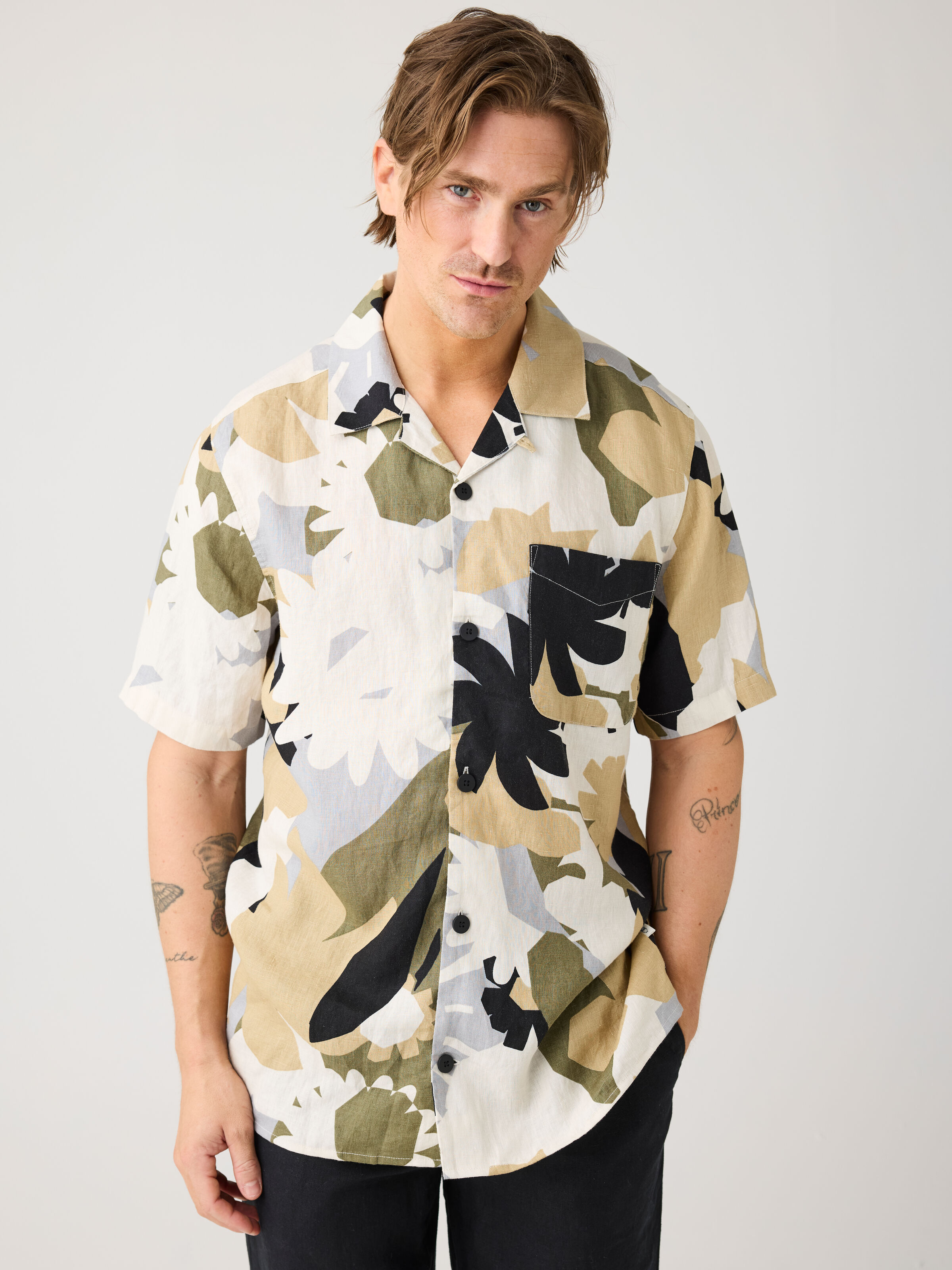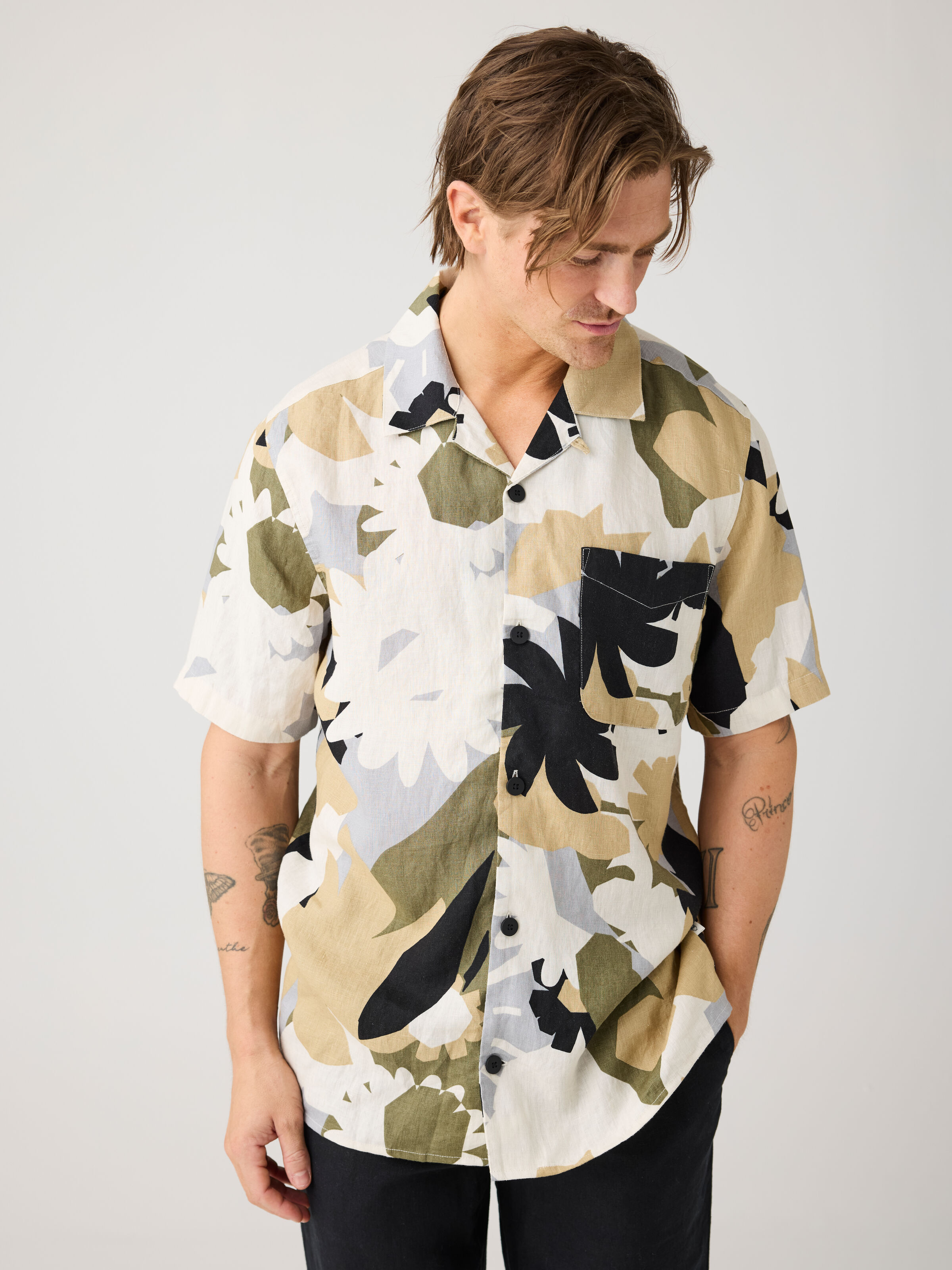Relaxed Linen Print Short Sleeve Skjorte, Green, XXL