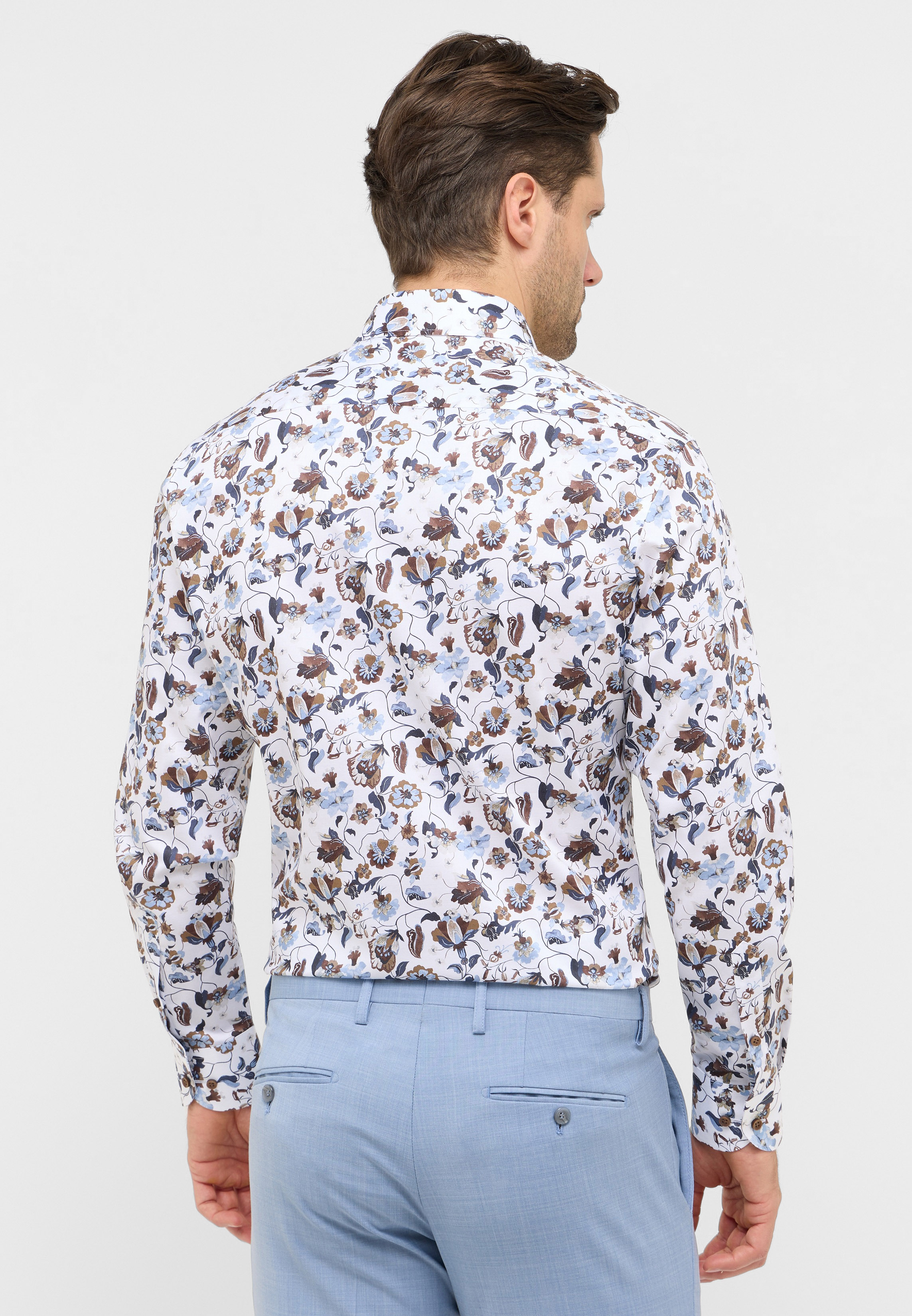 Skjorten har lange ærmer og en almindelig krave, hvilket gør den alsidig og passende til forskellige formelle og afslappede anledninger. Den moderne pasform sikrer en flot silhuet, der både er flatterende og behagelig at have på. Med Eterna's sans for detaljer og kvalitet får du en skjorte, der er lige så funktionel som den er stilfuld. Perfekt til dig, der ønsker at udstråle en selvsikker og raffineret stil.