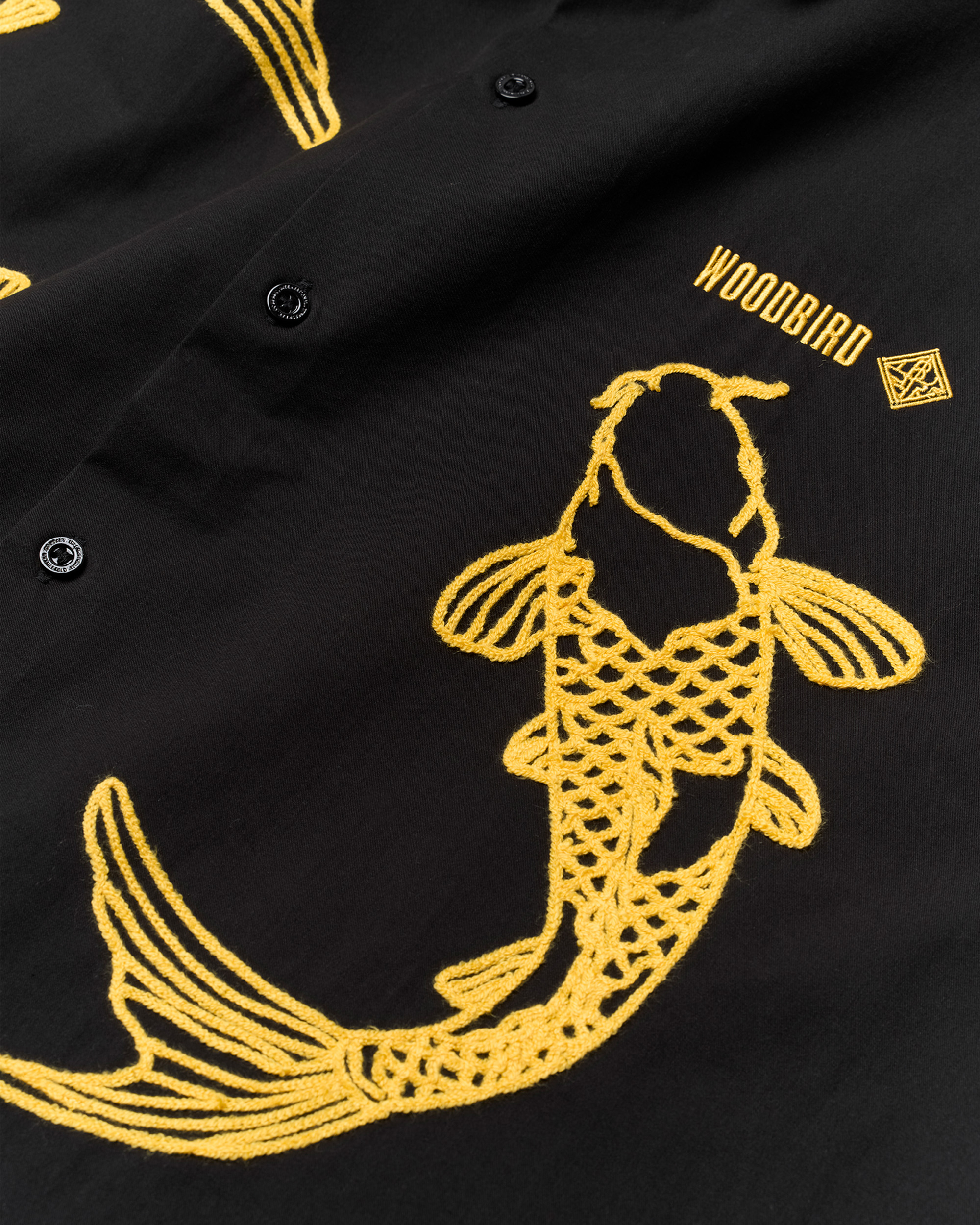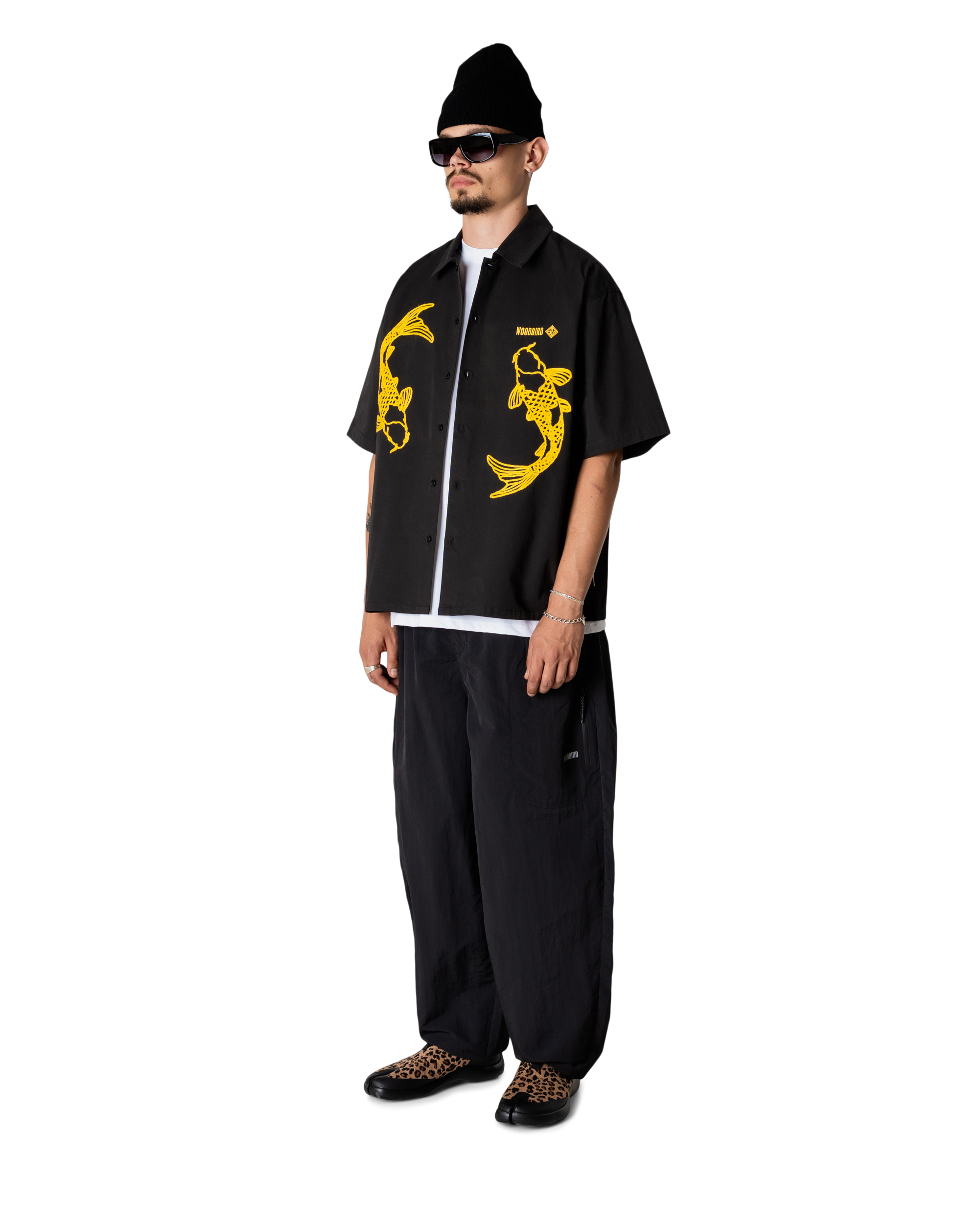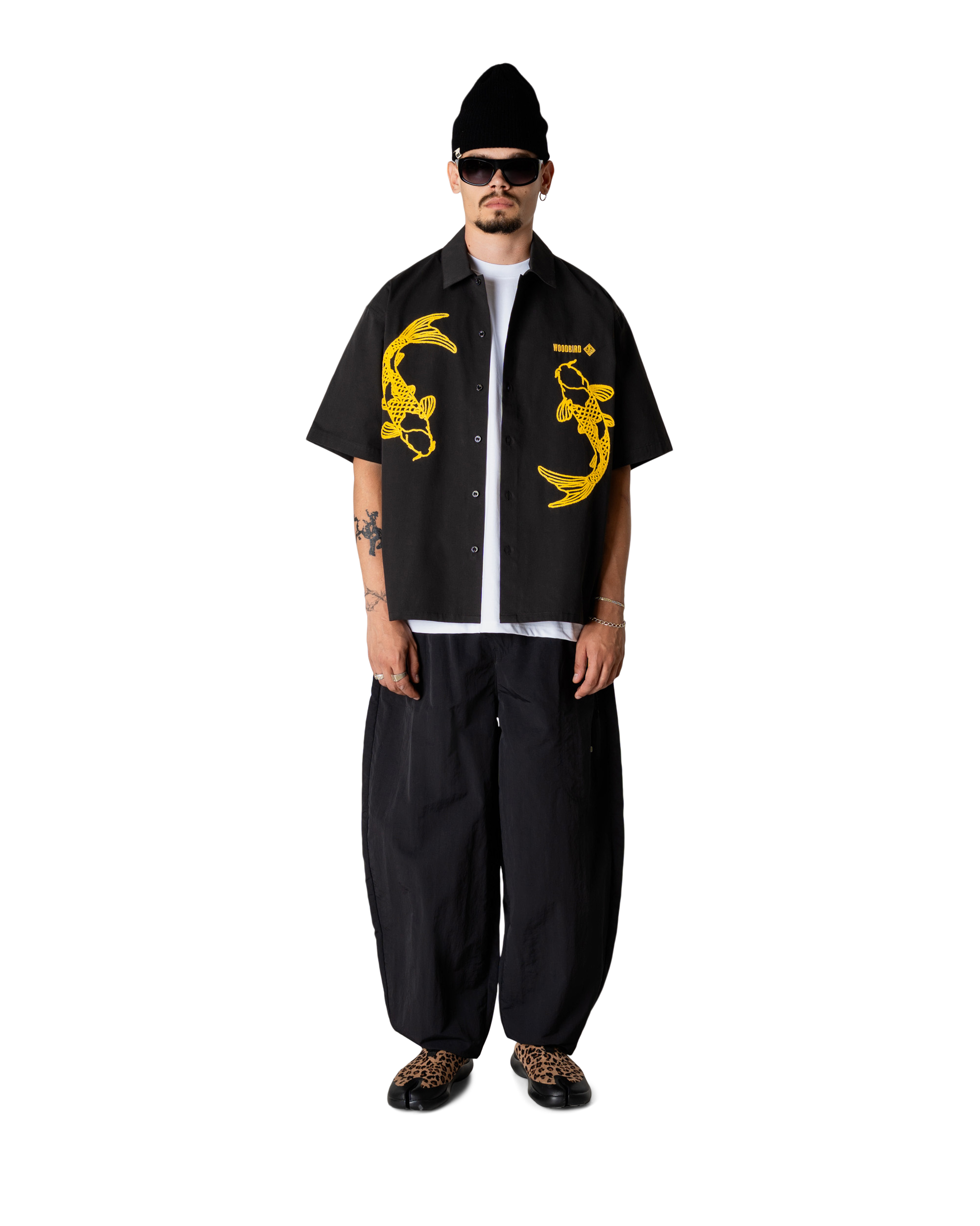 Opdag det unikke design af Wang Carp skjorten fra Woodbird, der perfekt kombinerer stil og komfort. Denne kortærmede skjorte er ideel til både afslappede og formelle anledninger. Skjorten prydes af en fængende detalje med Koi karpe fisk på hver side foran, hvilket tilføjer et kunstnerisk præg og skaber et blikfang. På venstre bryst finder du Woodbird-logoet, der diskret viser mærket, og understreger skjortens kvalitet og autenticitet.