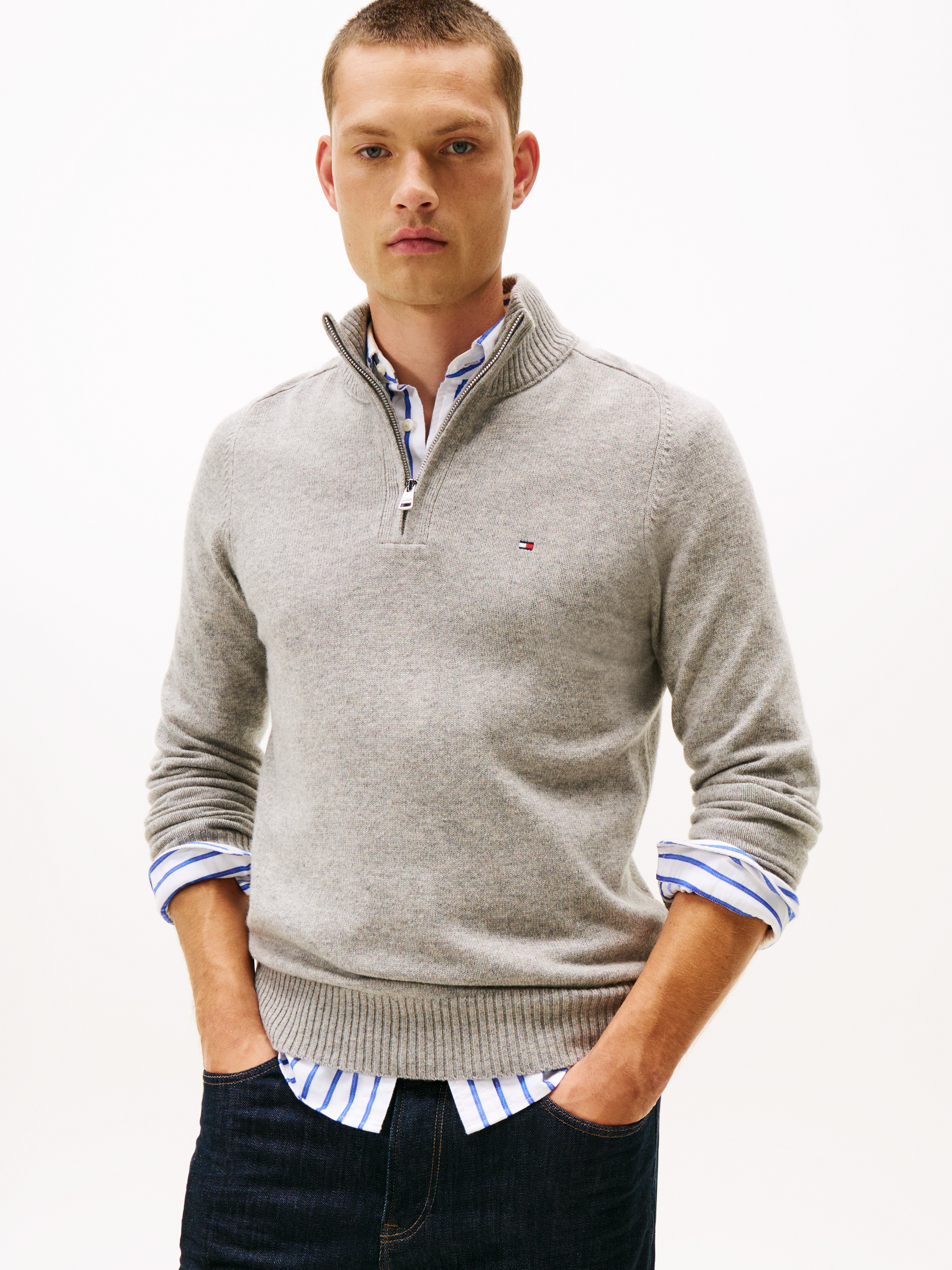 Lambswool Zip Mock Striktrøje, Light Grey Heather, 3XL