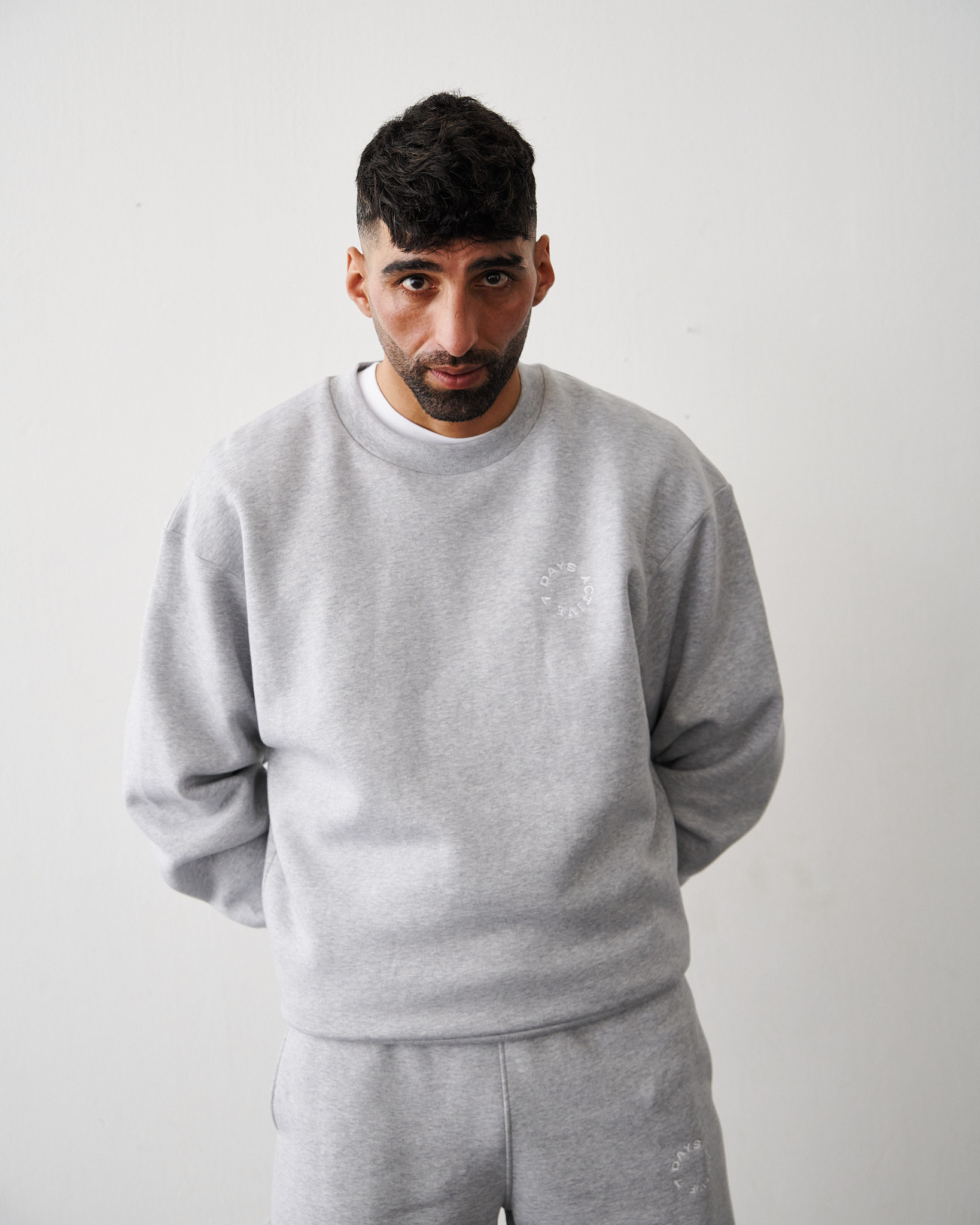 - Hvidt broderi af signatur-cirkellogo på brystet