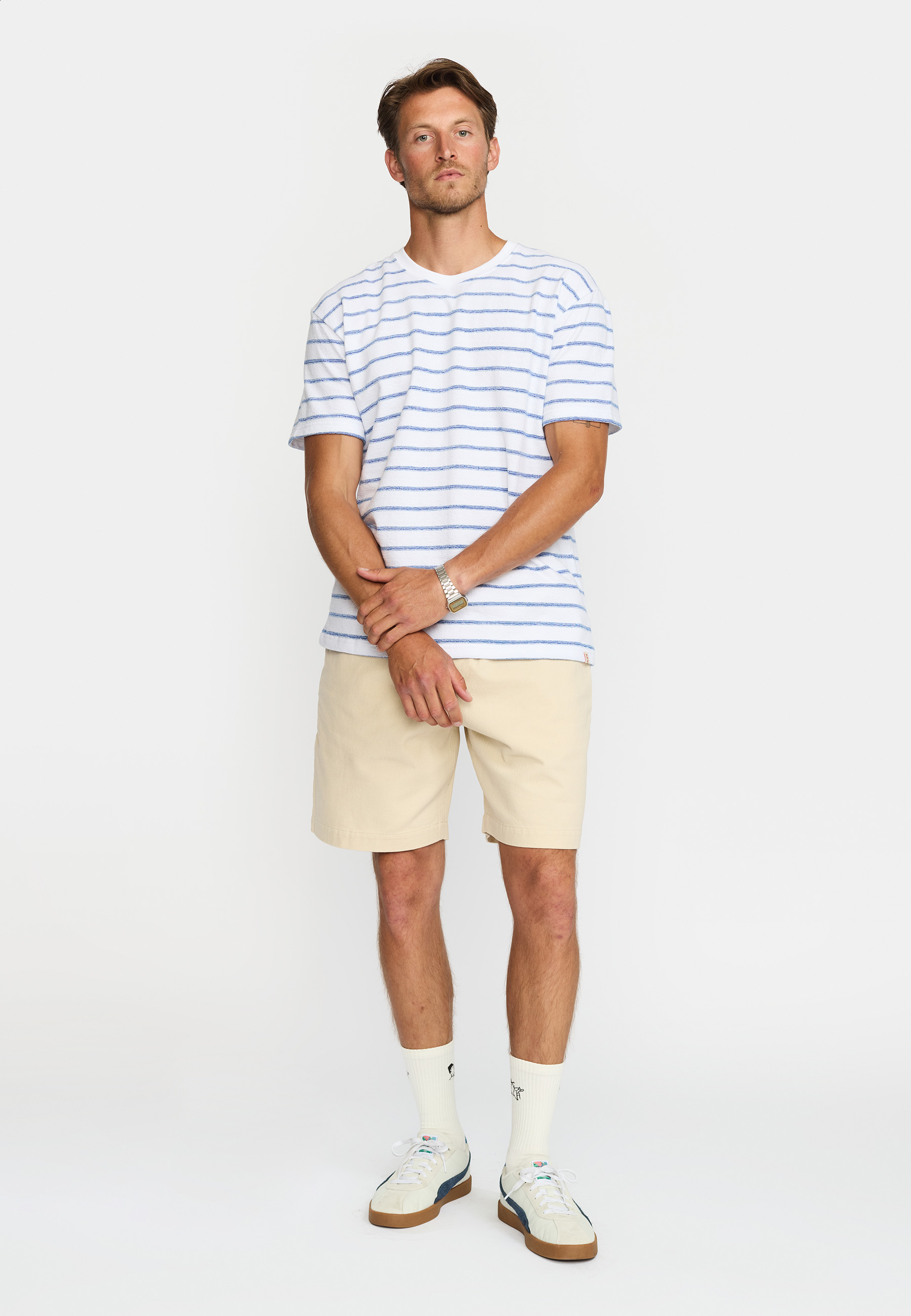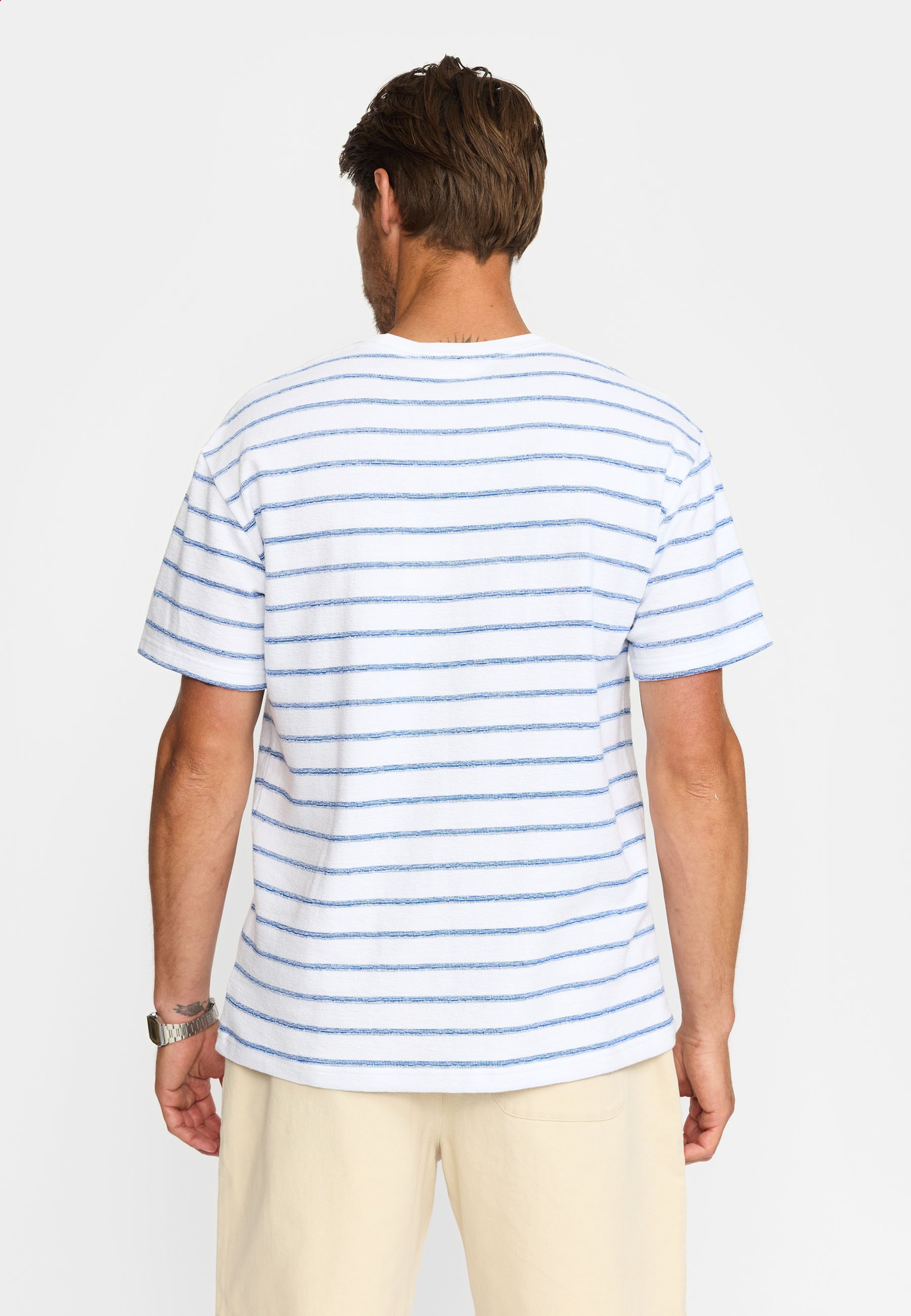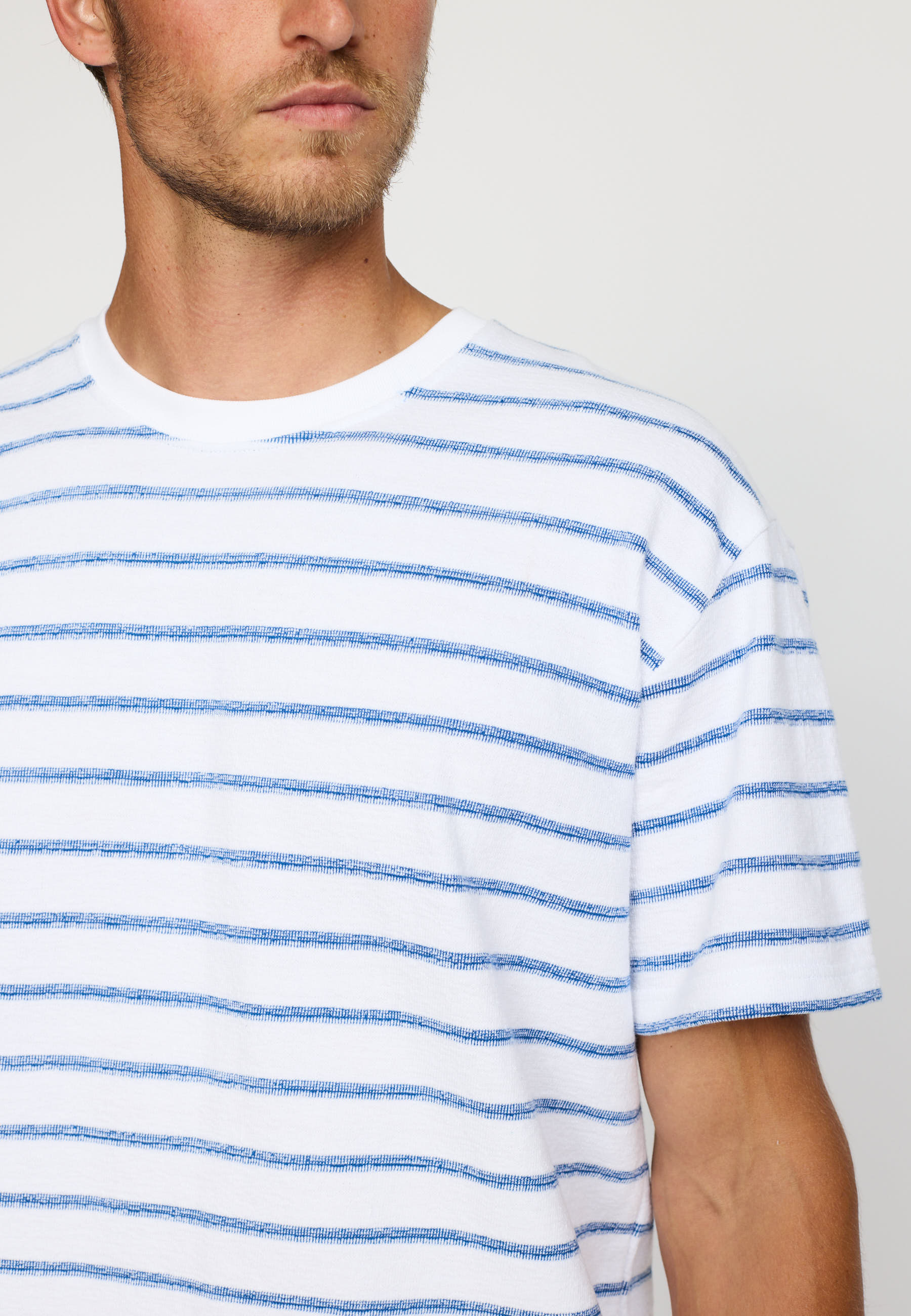 Det tofarvede stribede mønster bringer et friskt pust til din garderobe, og den runde hals giver en klassisk og tidløs appel. Med dens løse pasform sikrer T-shirten en behagelig og afslappet følelse, der gør den ideel til hverdagsbrug.