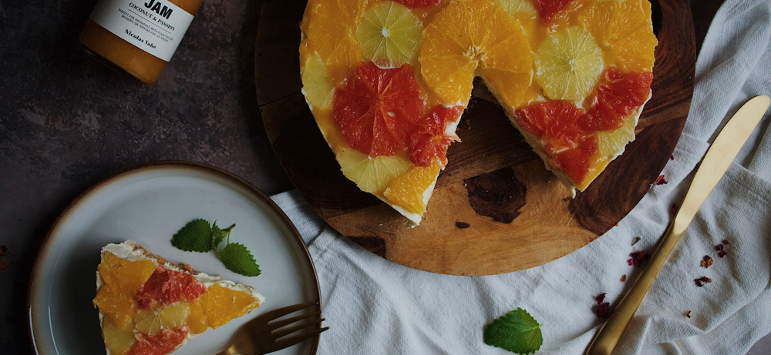 Vi har tilføjet mascarpone i vores ostecreme for en ekstra cremet konsistens og pyntet den flot med et tyndt lag marmelade og tynde skiver af vores yndlingscitrusfrugter.
