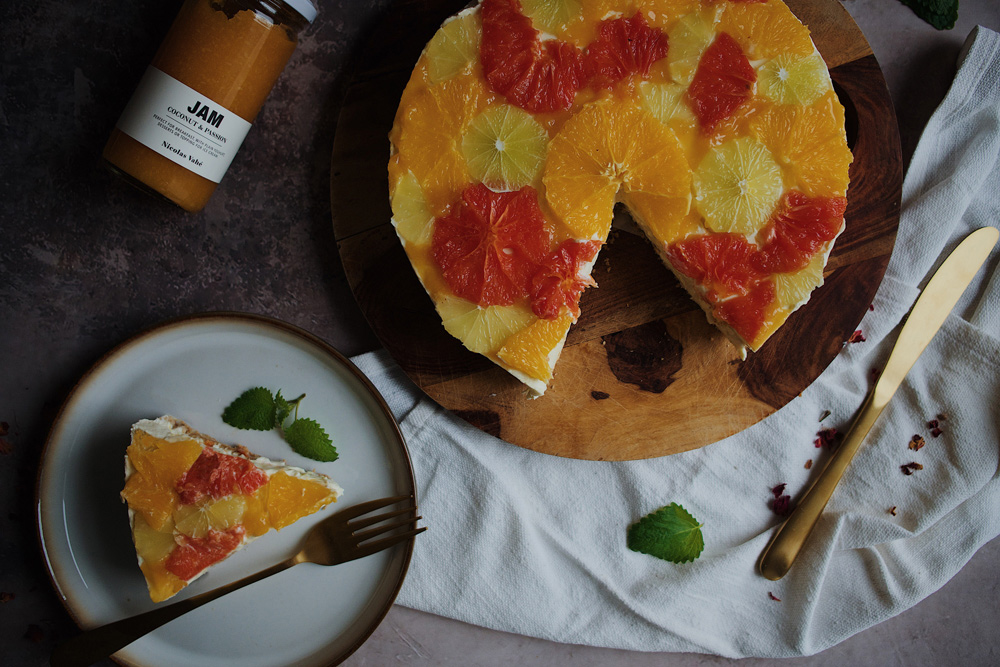 Vi har tilføjet mascarpone i vores ostecreme for en ekstra cremet konsistens og pyntet den flot med et tyndt lag marmelade og tynde skiver af vores yndlingscitrusfrugter.