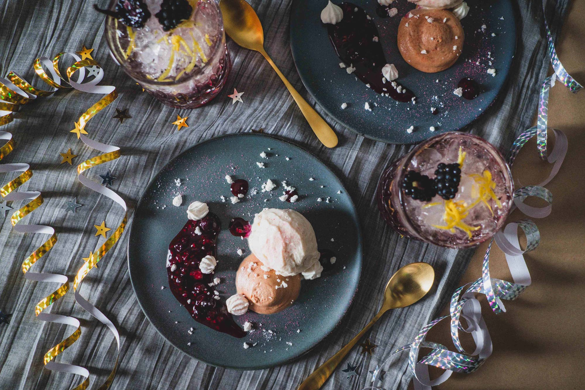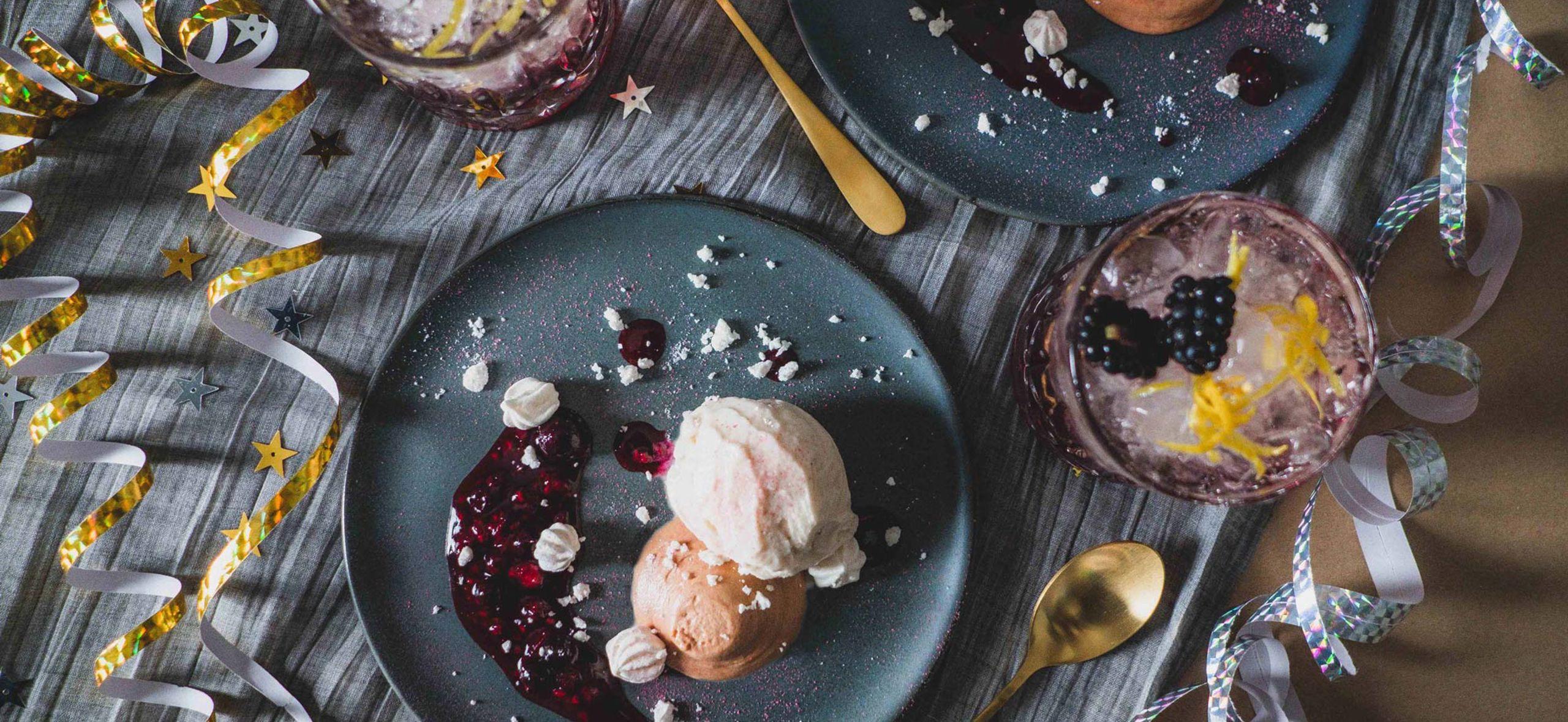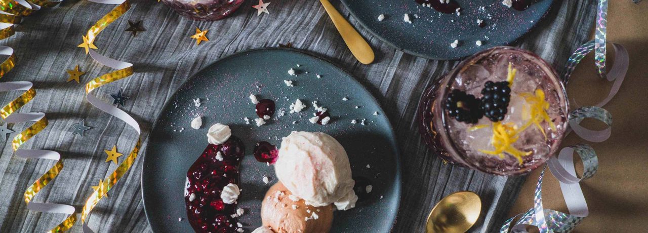 Årets sidste middag skal afsluttes med en luksuriøs og festlig dessert. En skøn og smuk anretning med kraftfuld chokolademousse lavet på mælkechokolade, cremet økologisk vaniljeis, sprøde marengskys og syrlig skovbærsauce. Afslut med et drys med hindbærstøv og lidt knust marengs. Du kan forberede alle elementerne dagen i forvejen og opbevare dem på køl, så du blot skal anrette desserten lige inden servering.