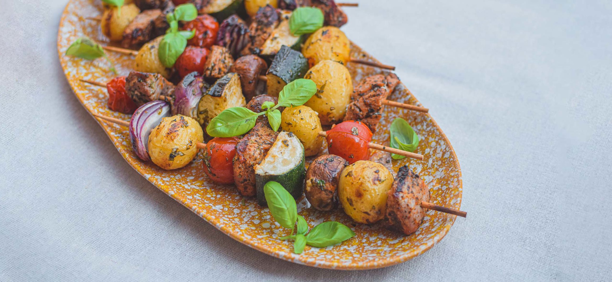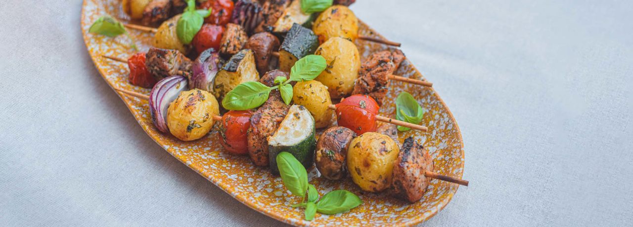 Start med at koge kartoflerne møre i letsaltet vand. Snit derefter grøntsagerne i mundrette stykker. Skær efterfølgende kødet ud. Fordel grøntsager og kød på dine spyd og pensel med din marinade. Krydder med salt og peber.
