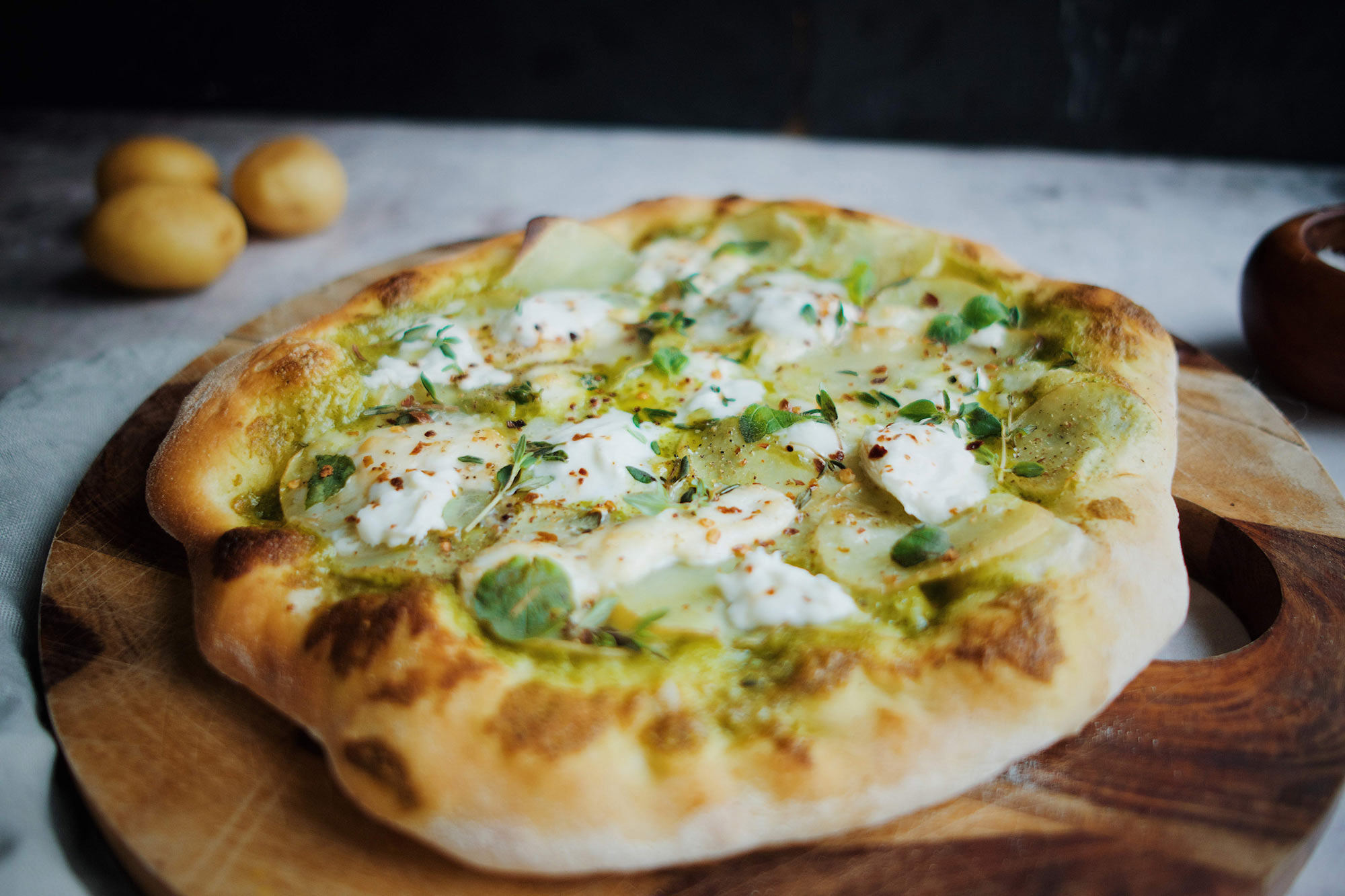 Top pizzaen med 1 spsk. frisk pesto, tyndskårede nye kartofler og en halv mozzarella revet i mindre stykker. Bag pizzaen i ca. 7 minutter eller til osten er smeltet og skorpen gylden og sprød. Har du en pizzasten, så smid den evt. på grillen for at opnå en ekstra lækker skorpe. Server med lidt frisk timian, oregano, en smule frisk mozzarella og et par dråber god olivenolie.