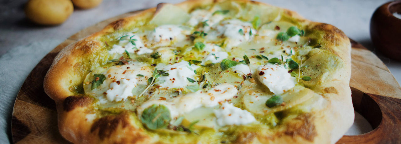 Prøv denne lækre pizza med hjemmelavet pesto, nye danske kartofler og frisk mozzarella. Prøv med en koldhævet pizzadej, der gerne må hæve i op til 48 timer. Det giver en super struktur i bunden.