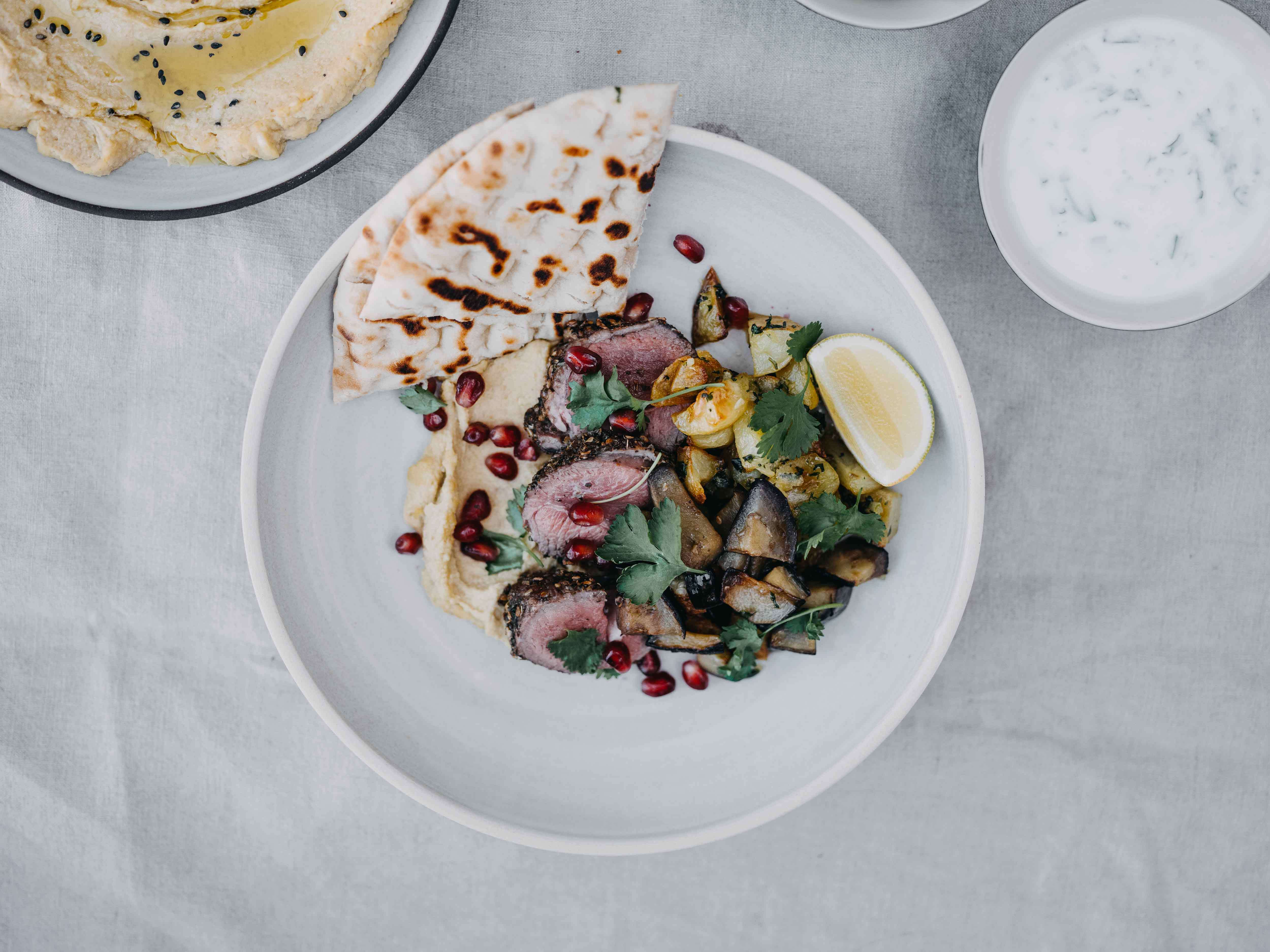 I Salling Super elsker vi lam. Vi guider dig derfor til denne libanesisk inspirerede ret med krydrede kartofler a la batata harra, stegt aubergine, cremet hummus og selvfølgelig Za´atar krydret lammeculotte. Top med lidt yoghurtdressing, granatæblekerner og koriander og du har en smuk ret, der passer godt til en weekend med gode venner.