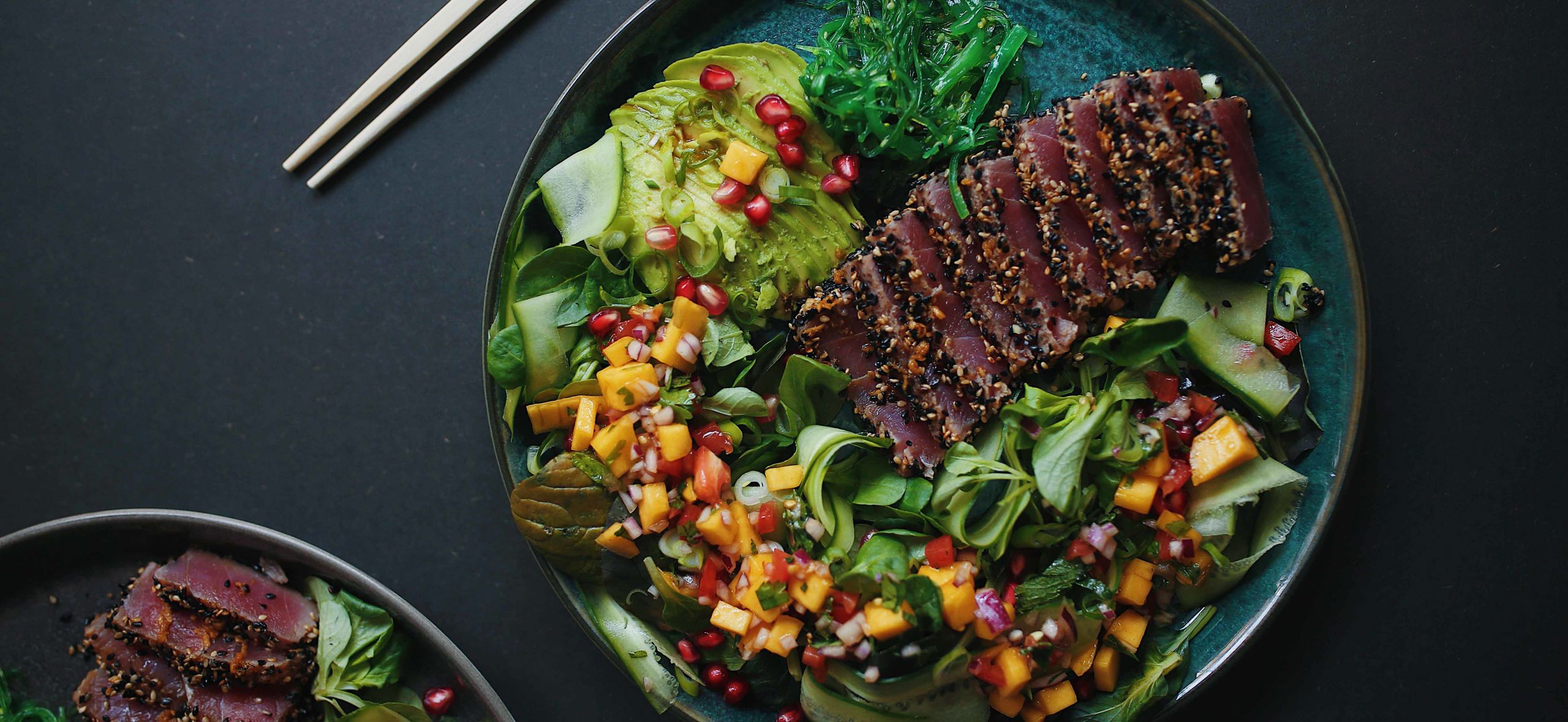 Anret tallerknerne med en bund af salat, mandolinrevet agurk, finthakket forårsløg og 1/2 avokado skåret i skiver. Skær nu tunen i mundrette skiver og placer oven på salaten. Afslut med granatæblekerner, mangosalsa og tangsalat. Hæld evt. resterne af marinaden over den færdiganrettede tun.