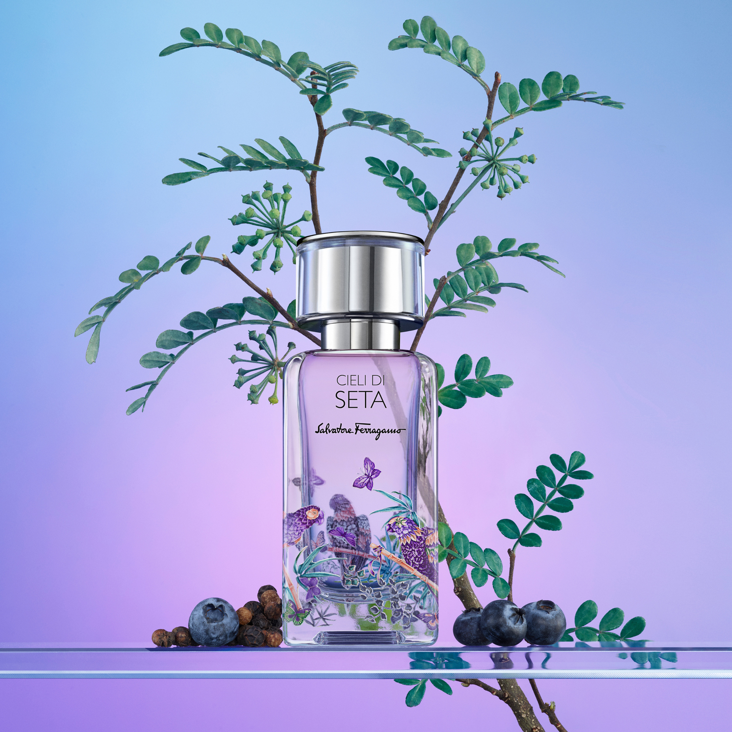 Cieli di Seta Eau de Parfum fra Ferragamo inviterer dig til en drømmeverden, hvor violette nuancer fylder himlen, bløde skyer svæver frit, og fugle danser elegant til naturens symfoni. Denne delikate og eteriske duft afspejler Ferragamos ikoniske silkearv og tilbyder en oplevelse, der er både beroligende og strålende.