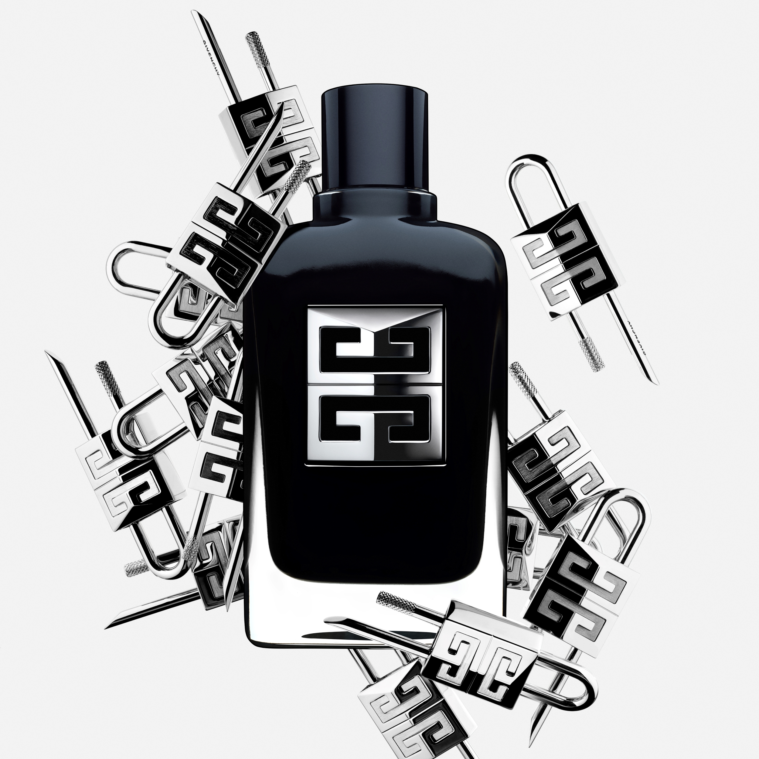 Flasken genfortolker det ikoniske Gentlemen-design med inspiration fra modehusets couture-kollektion for at skabe et raffineret udtryk. Den dybe, sorte lakering fuldendes af Givenchys signatur – det sølvfarvet 4G-logo, der pryder flakonens front som et eksklusivt emblem. Med Gentlemen Society introducerer Givenchy det ultimative duftritual.