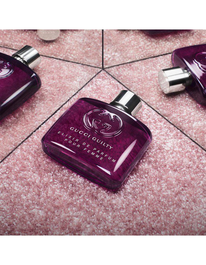 Gucci Guilty Pour Femme Elixir de Parfum er en intens duft til en intens forbindelse og er en amberagtig blomster- og træagtig duft til kvinder. Guilty Elixirs er en dristig påstand, en farverig ekstraversion: sensuelle og provokerende dufte, der er en kærlig invitation til at acceptere, hvem vi er, og lade vores autentiske selv blive set, mens vi fejrer kærlighedens utallige iterationer. Parfumeurene Quentin Bisch og Nathalie Cetto har givet denne Gucci-duft en sensuel og mystisk base af vaniljeabsolut, der vækkes af mørke tonkabønner, suppleret med Gucci Guiltys signatur af jordagtig patchouli, mandora og blomsteragtig og feminin blåregn. Duften til kvinder afrundes af en topnote af citrussyrlig bergamot, som er smukt afbalanceret af rose, osmanthus og en sød og blød violakkord. Gucci-duften er indpakket i en overdådig lilla glasflaske, en romantisk påmindelse om feminin magt og en afspejling af den intense duft, der ligger indeni. Flasken til denne smukke duft leger uventet med transparens og har et præget GG-logo: dyrebare ingredienser koncentreret i en kolbe.